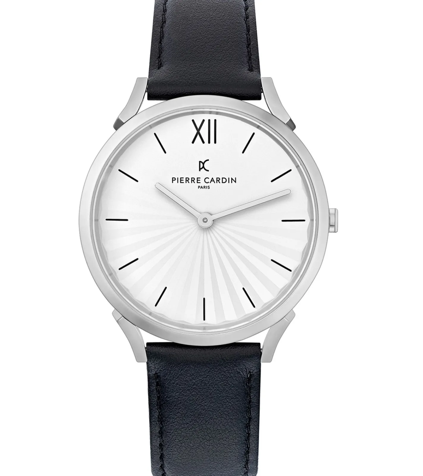 Pierre Cardin Damen Armband-Uhr schlichtes Ziffernblatt analoge Quarz-Uhr mit Leder-Armband 3ATM 40mm CPI.2000 Schwarz/Silber