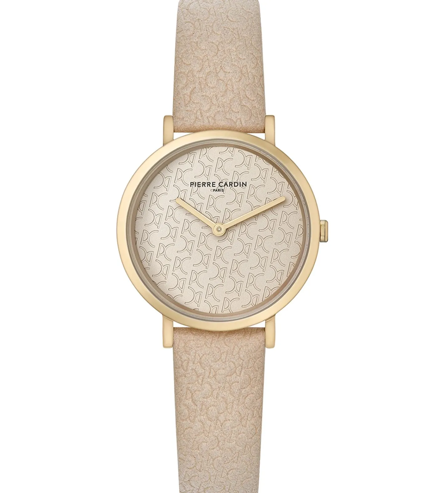 Pierre Cardin Damen vergoldete Armband-Uhr mit Marken-Kürzel-Print analoge Quarz-Uhr mit Leder-Armband 3ATM 31mm CBV.1503 Beige/Gold
