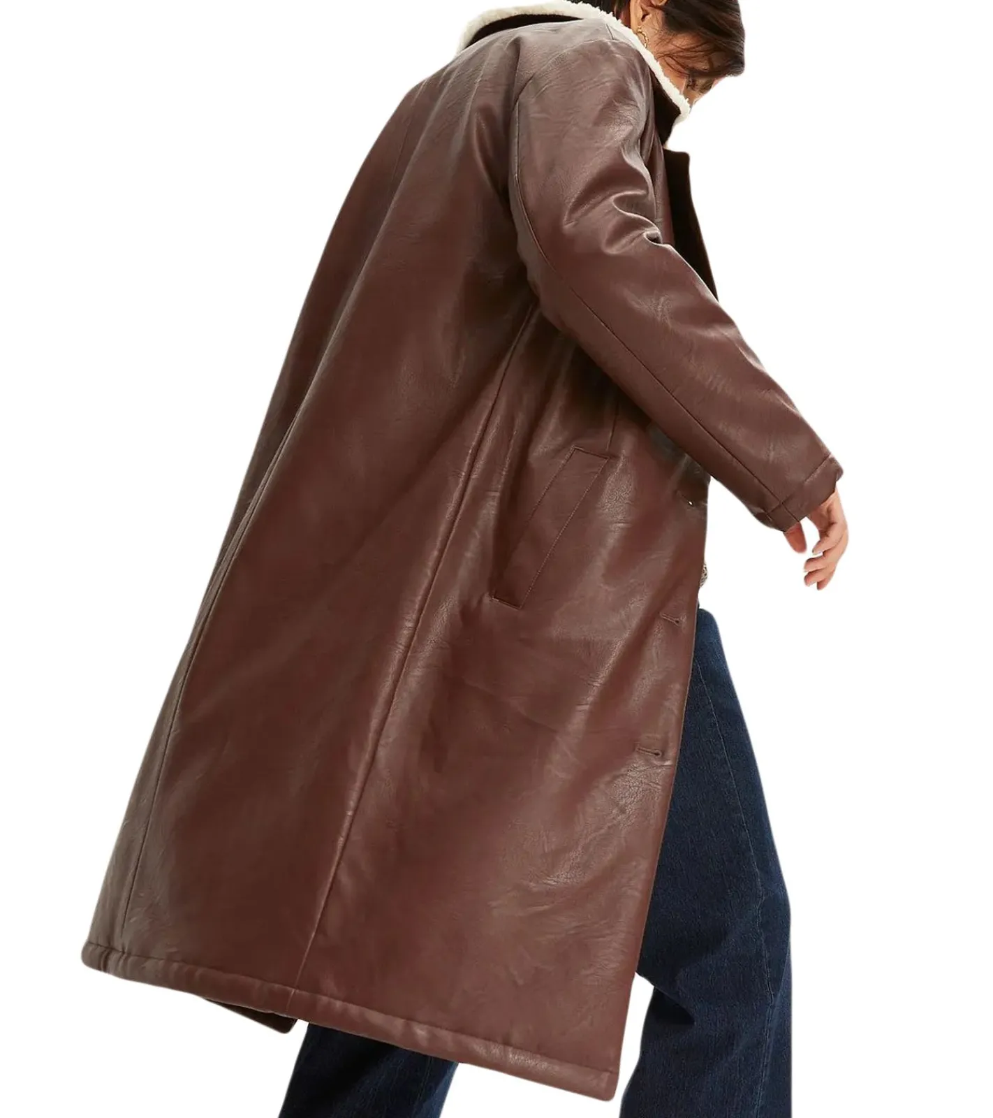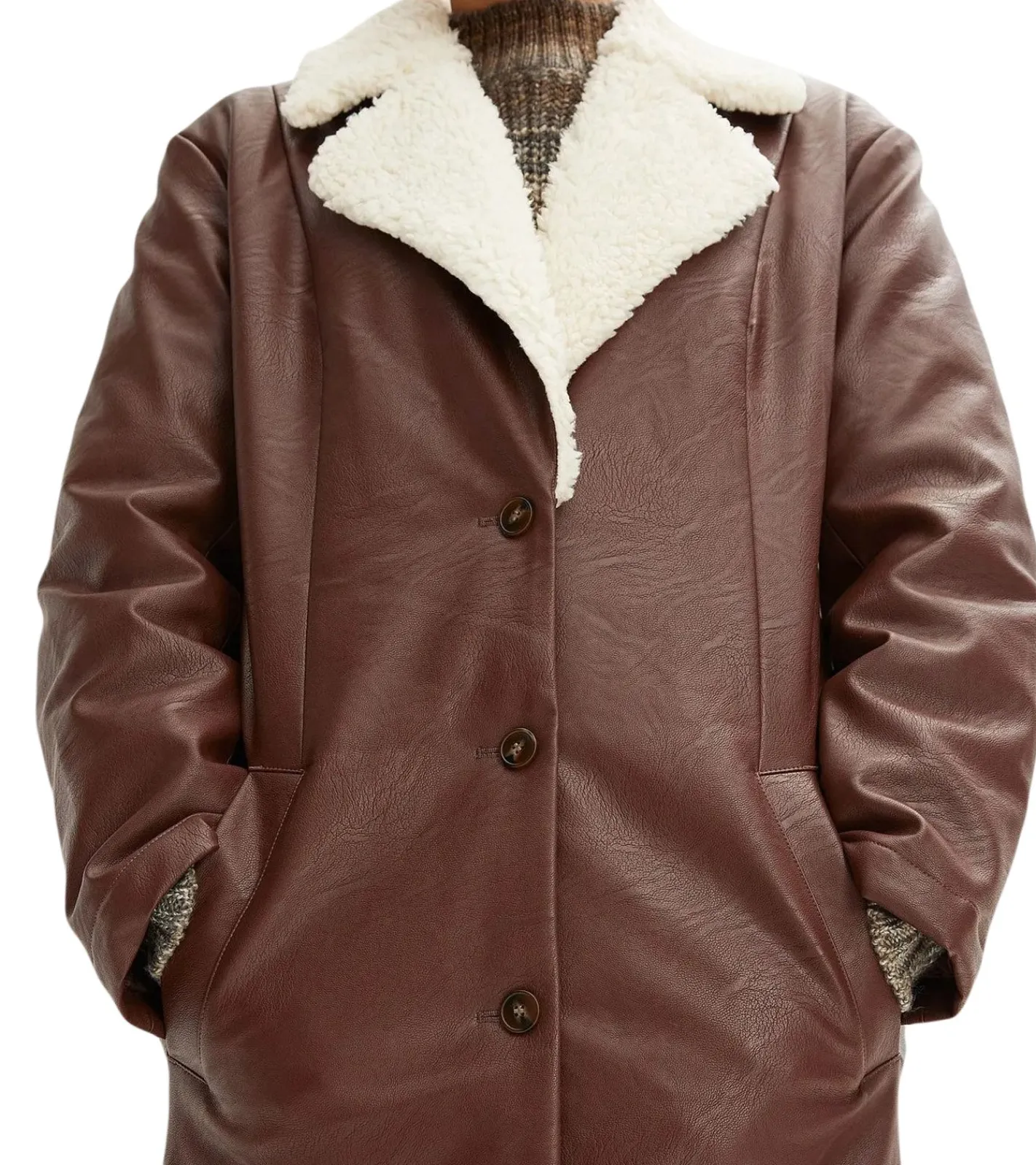 Damen Lederimitat-Mantel mit Teddyfell Kragen Oversized Alltags-Mantel Langarm-Jacke Übergangs-Jacke 915415 Dunkelbraun/Creme