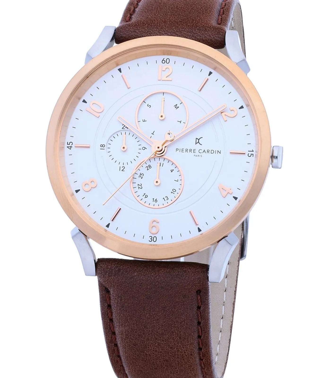 Pierre Cardin Herren Armband-Uhr mit Multi-Ziffernblatt analoge Quarz-Uhr mit Leder-Armband 3ATM 44mm CPI.2060 Braun/Rosegold/Silber