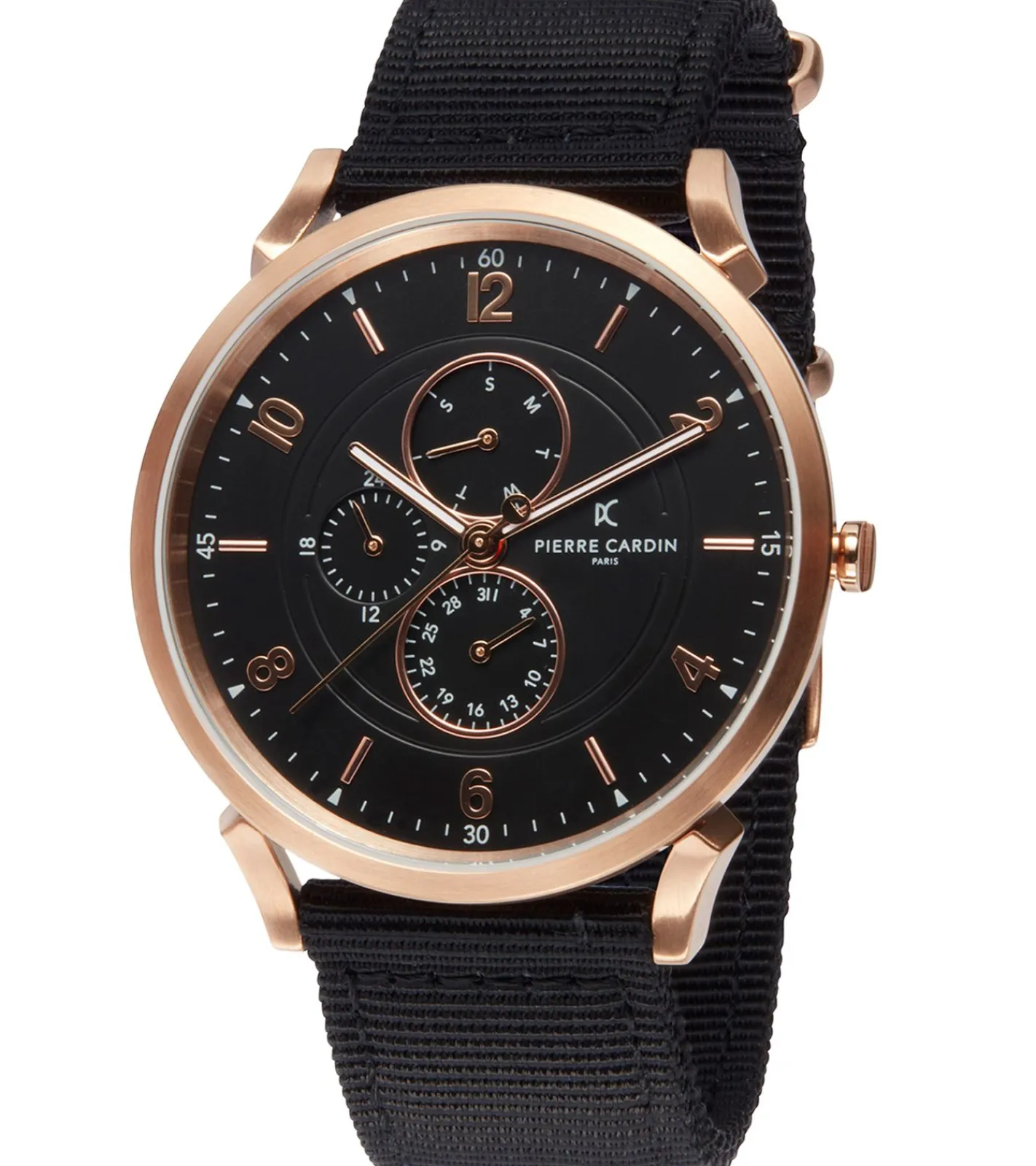 Pierre Cardin Herren Armband-Uhr mit Multi-Ziffernblatt analoge Quarz-Uhr mit Textil-Armband 3ATM 44mm CPI.2035 Schwarz/Kupfer