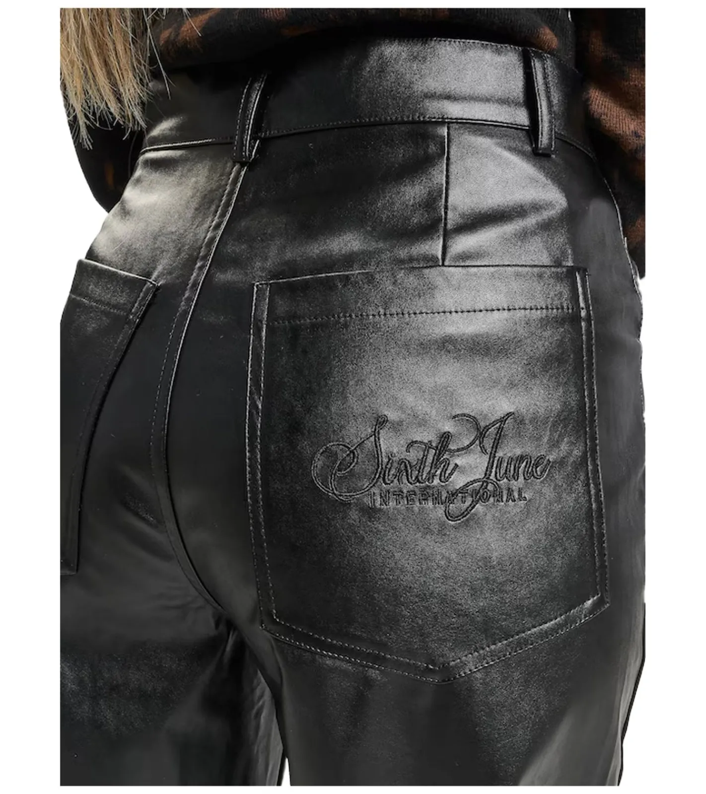 Sixth June Damen Kunstleder-Hose Schlag-Hose mit Marken Stickerei Alltags-Hose 33612CPA Schwarz