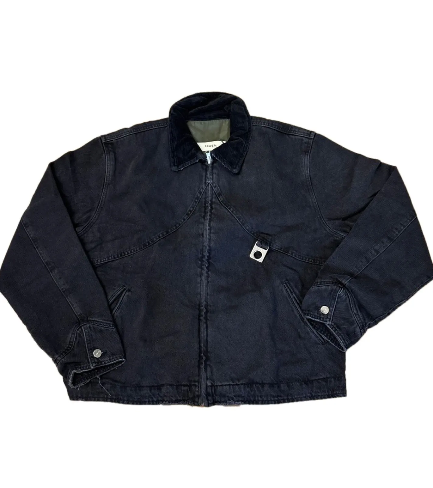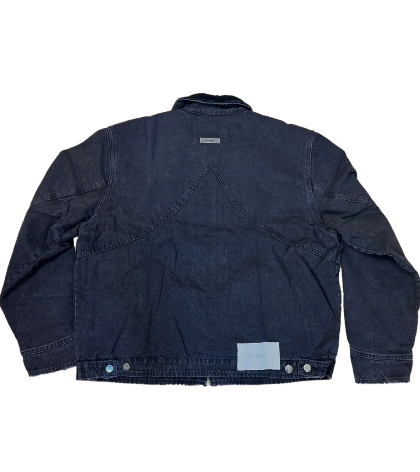 - Die abgebildete Jacke ist eine dunkle Jeansjacke der Marke ROUGH.