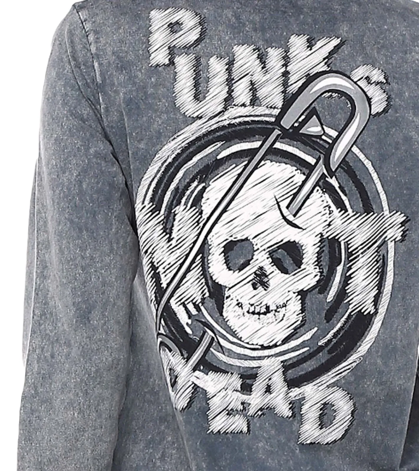 - großer Rücken-Print mit Totenkopf, Sicherheitsnadel und Schriftzug