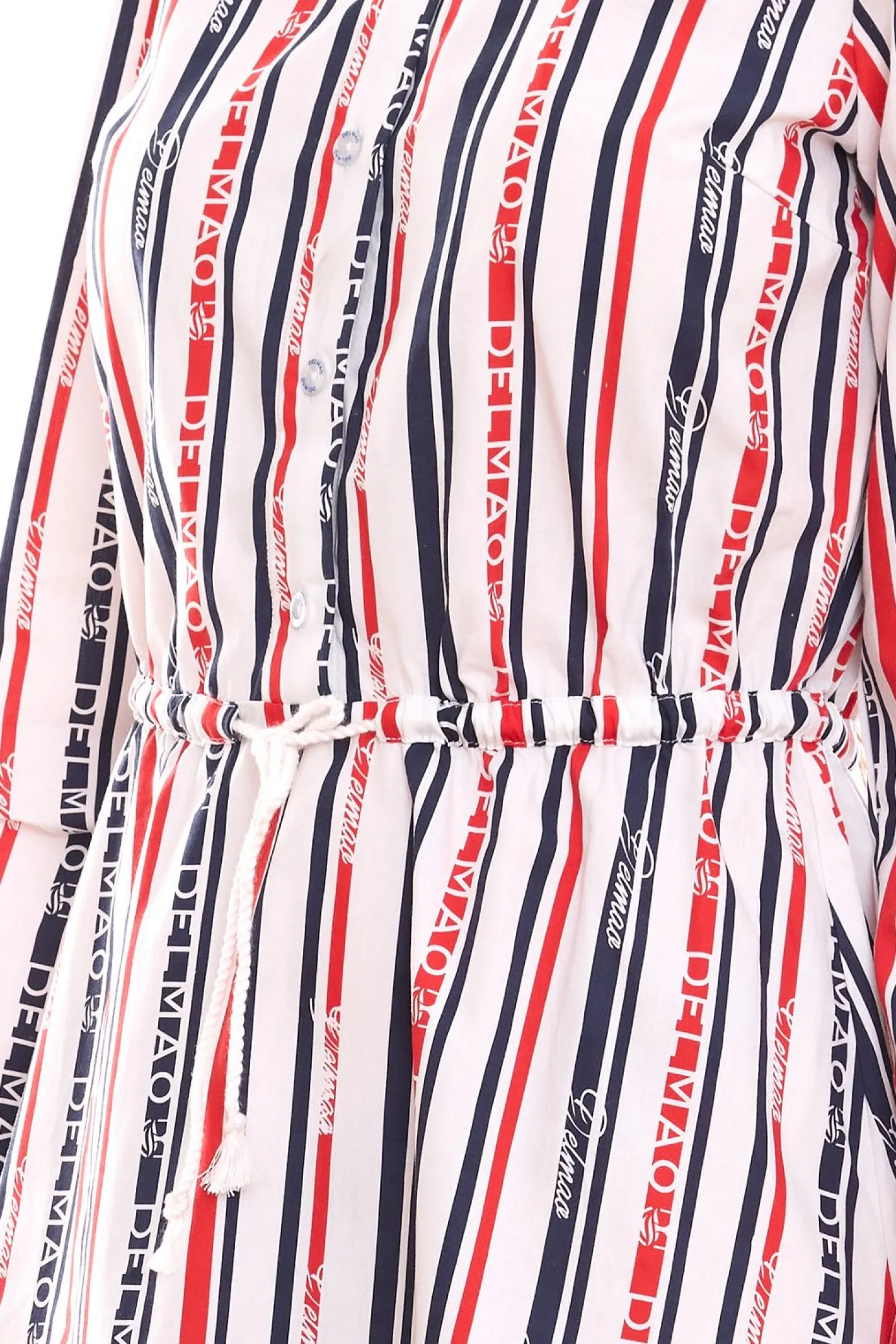 DELMAO Damen Baumwoll-Kleid Mini-Kleid gestreiftes Langarm-Kleid Blusen-Kleid Weiß/Blau oder Weiß/Blau/Rot