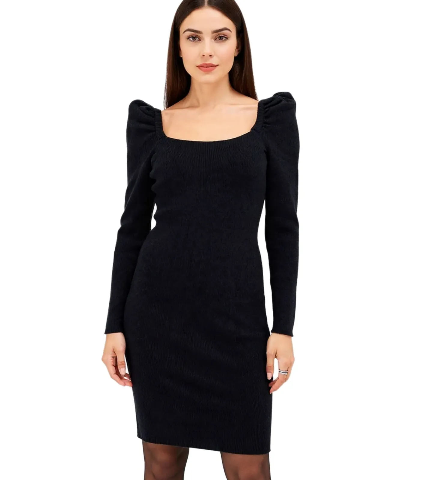Damen Ripp-Strick-Kleid mit Karree-Ausschnitt Mini-Kleid mit langen Ärmeln 906800 Schwarz