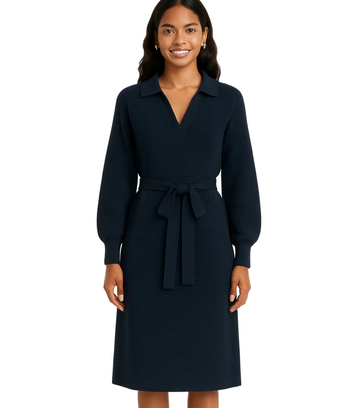 Damen Strick-Kleid Mini-Kleid mit Polo-Kragen Langarm-Kleid Baumwoll-Kleid 913278 Dunkelblau