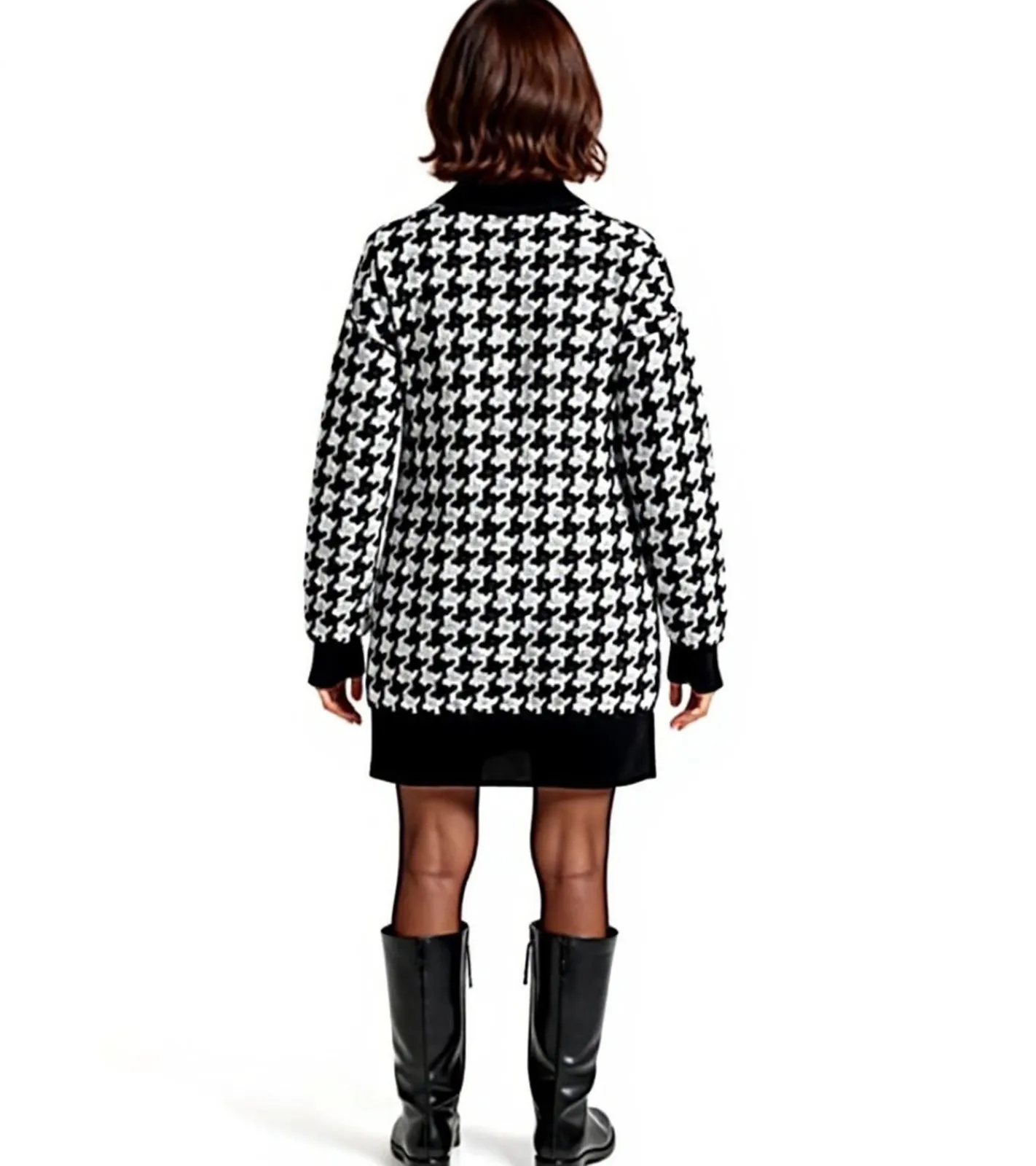 Damen Strick-Kleid mit Hahnentritt-Muster Mini-Kleid mit langen Ärmeln und Stehkragen 914658 Schwarz/Weiß