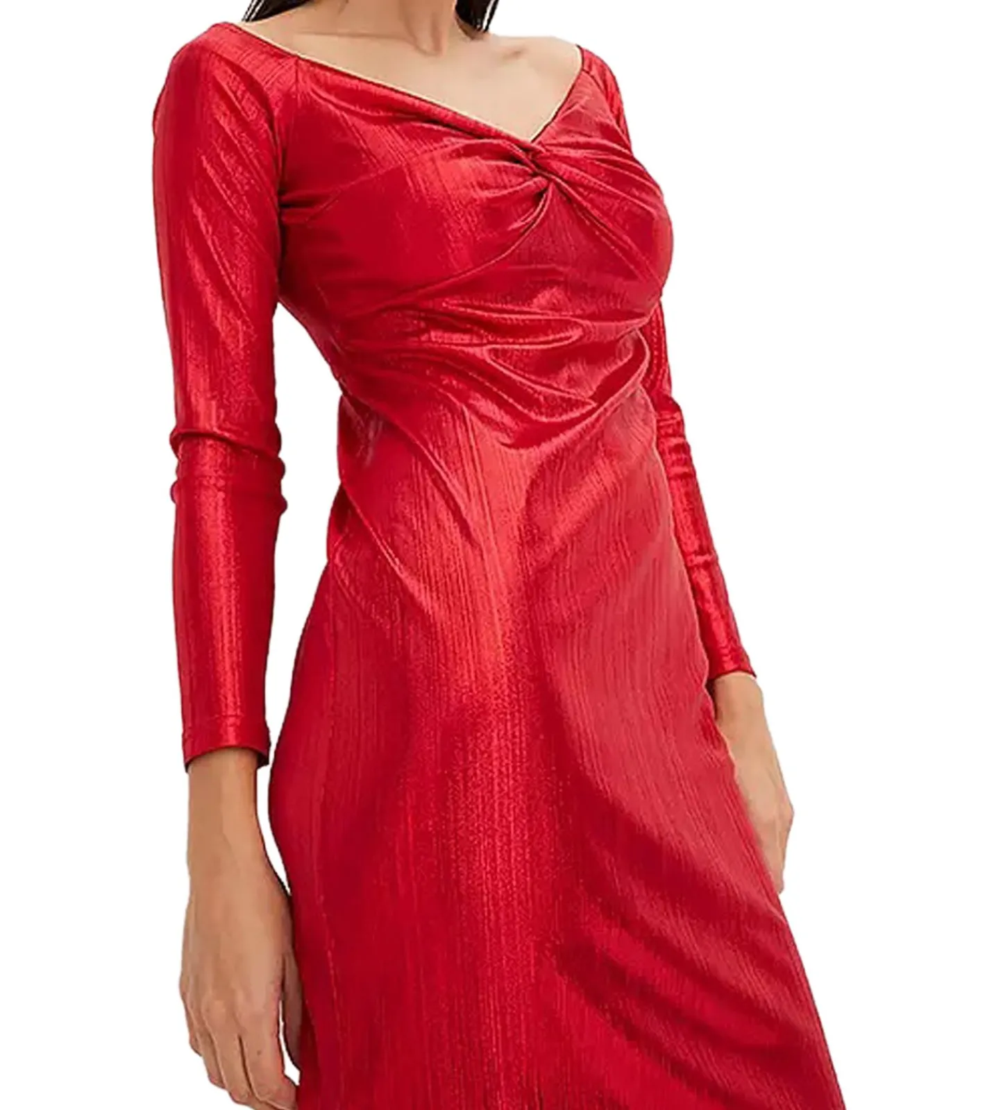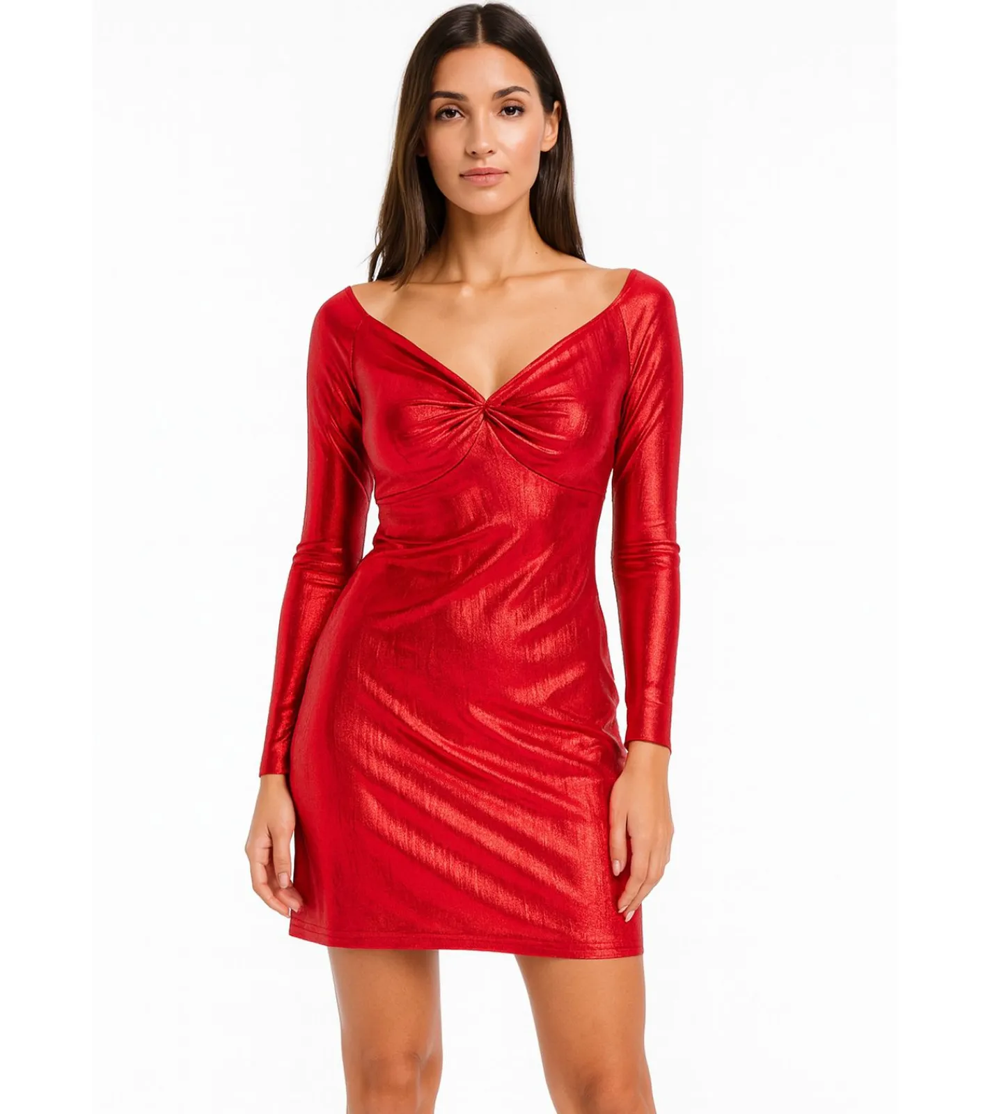 elegantes Damen Jersey-Kleid mit Metallic-Effekt Abend-Kleid mit langen Ärmeln 922945 Rot