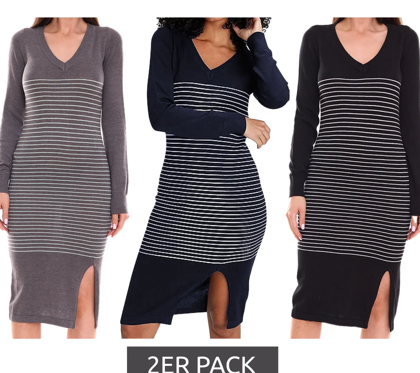 2er Pack AjC Damen Pullover-Kleid gestreift Midi-Kleid Strick-Kleid in Grau, Schwarz oder Blau