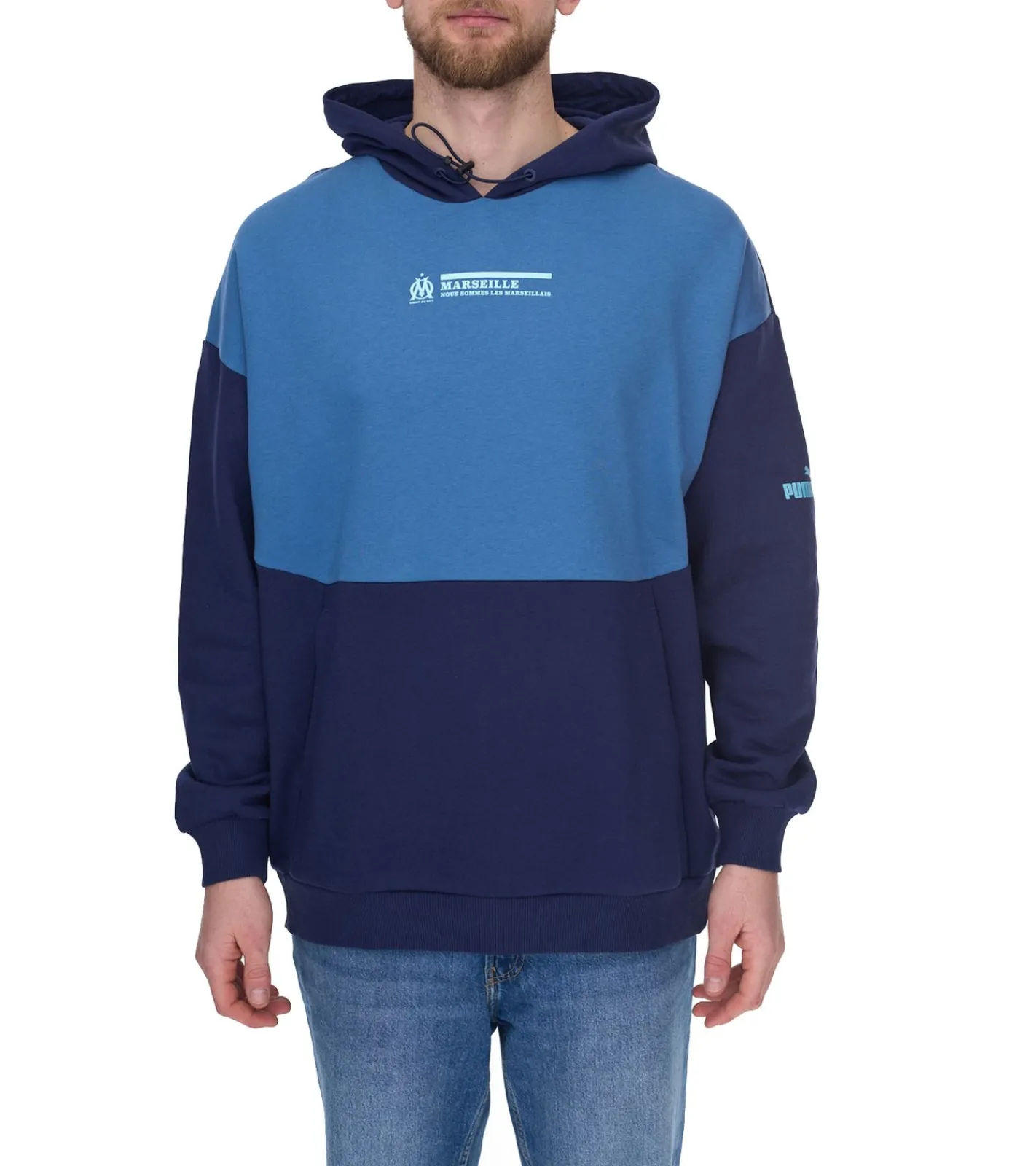 PUMA OLYMPIQUE DE MARSEILLE Herren Kapuzen-Pullover nachhaltiger Baumwoll-Hoodie mit Logo-Schriftzug 771970 15 Blau