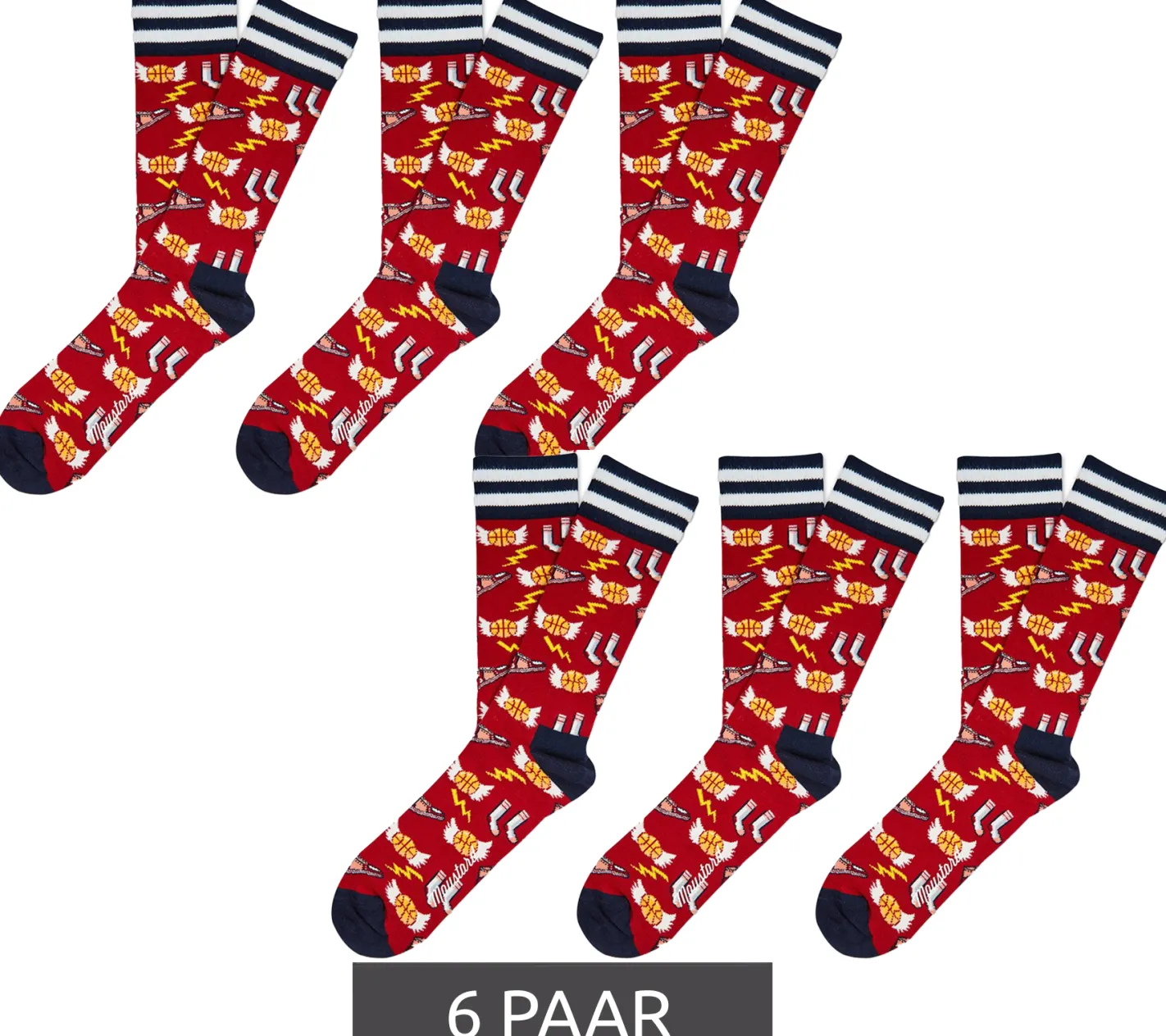 6 Paar Moustard Basketball Baumwoll-Socken mit Basketball Motiven gemusterte lange Strümpfe 17S-BASKET Rot/Schwarz/Bunt