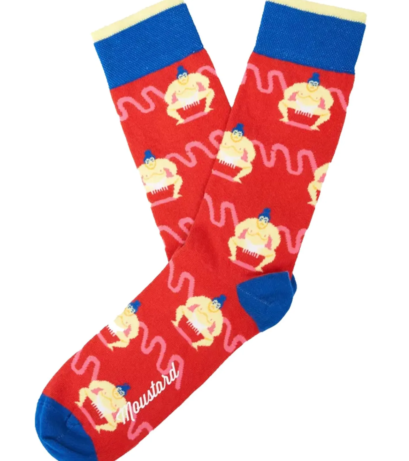 6 Paar Moustard Sumo Baumwoll-Socken mit Sumoringern gemusterte lange Strümpfe 22S-SUMO Rot/Blau