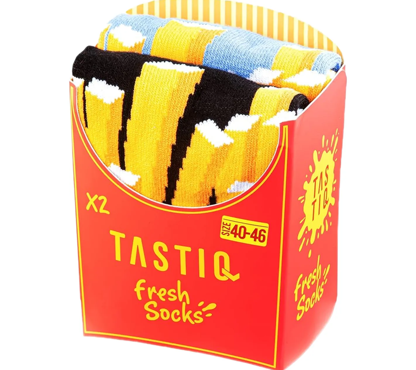 2 Paar TASTIQ Baumwoll-Socken mit Print lange Strümpfe in Geschenkbox TAS/1/CSX2 mit Pommesdruck oder mit Latte Macchiato Print