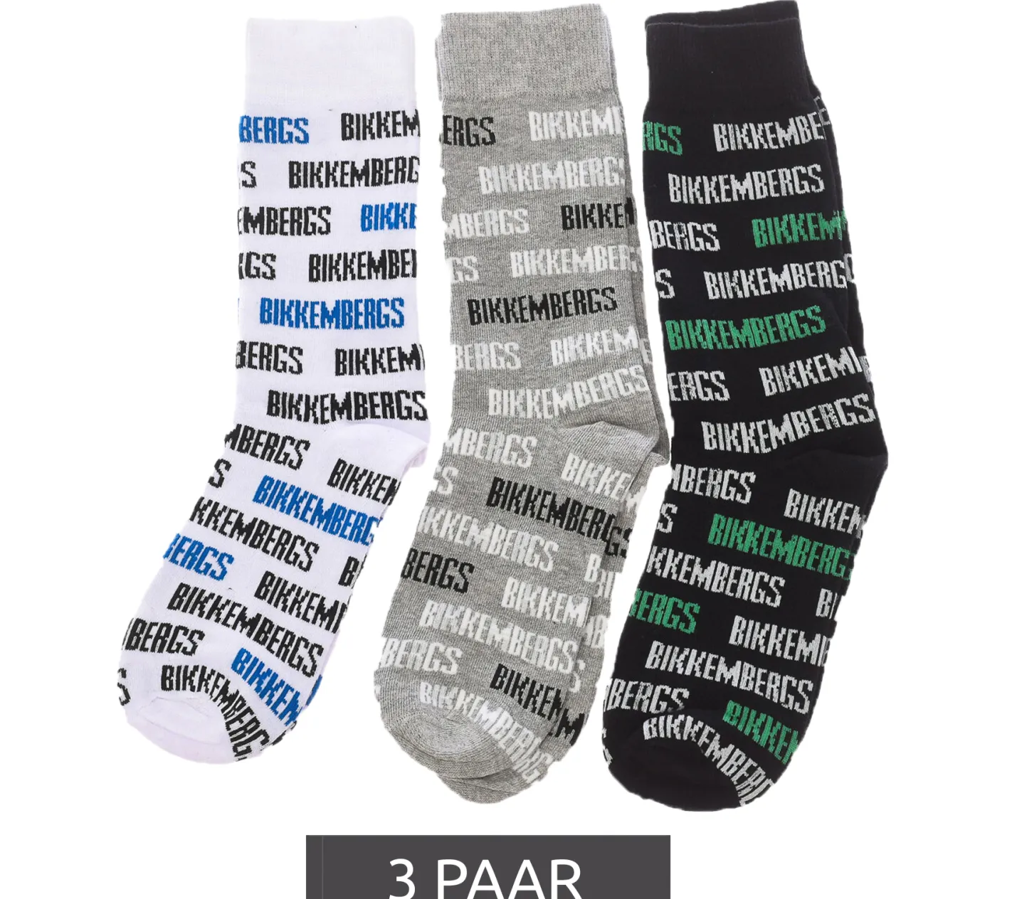 3 Paar BIKKEMBERGS Surtido Herren Tennis-Socken mit Allover Marken-Print Baumwoll-Strümpfe BF_010 Weiß/Schwarz/Grau