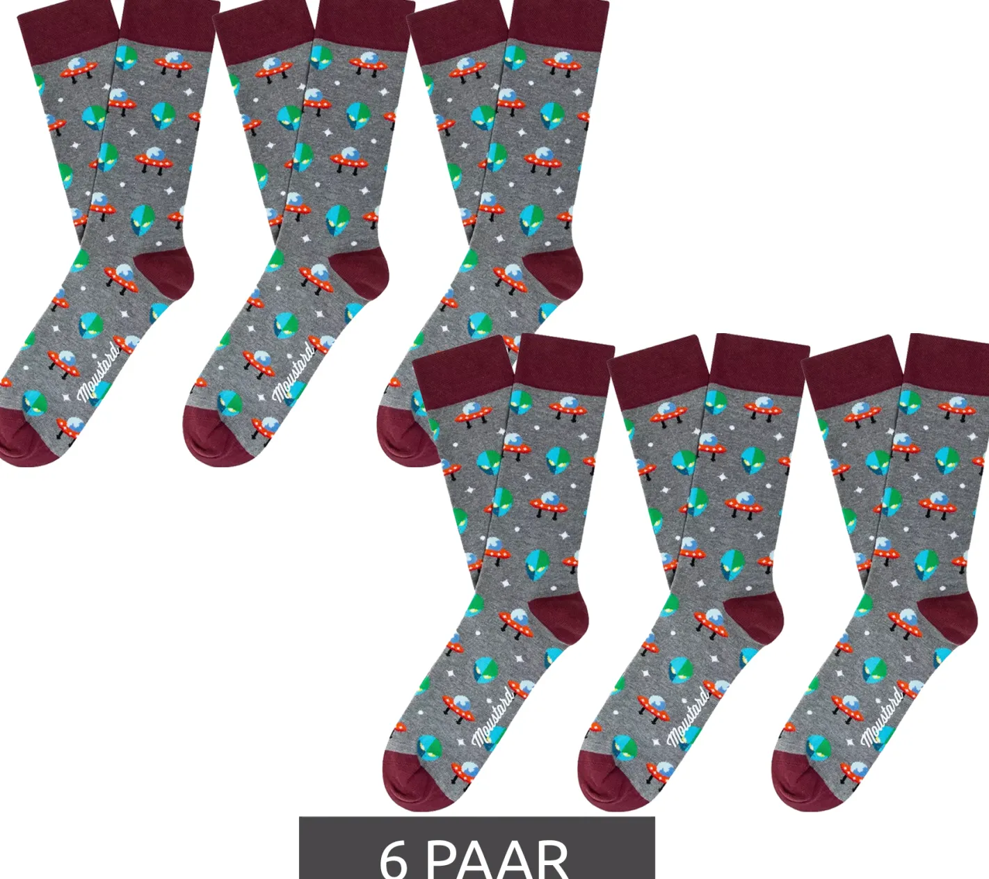 6 Paar Moustard Alien Herren Baumwoll-Socken mit Alien und Ufo Allover-Print gemusterte lange Strümpfe 17S-ALIEN Dunkelrot/Grau