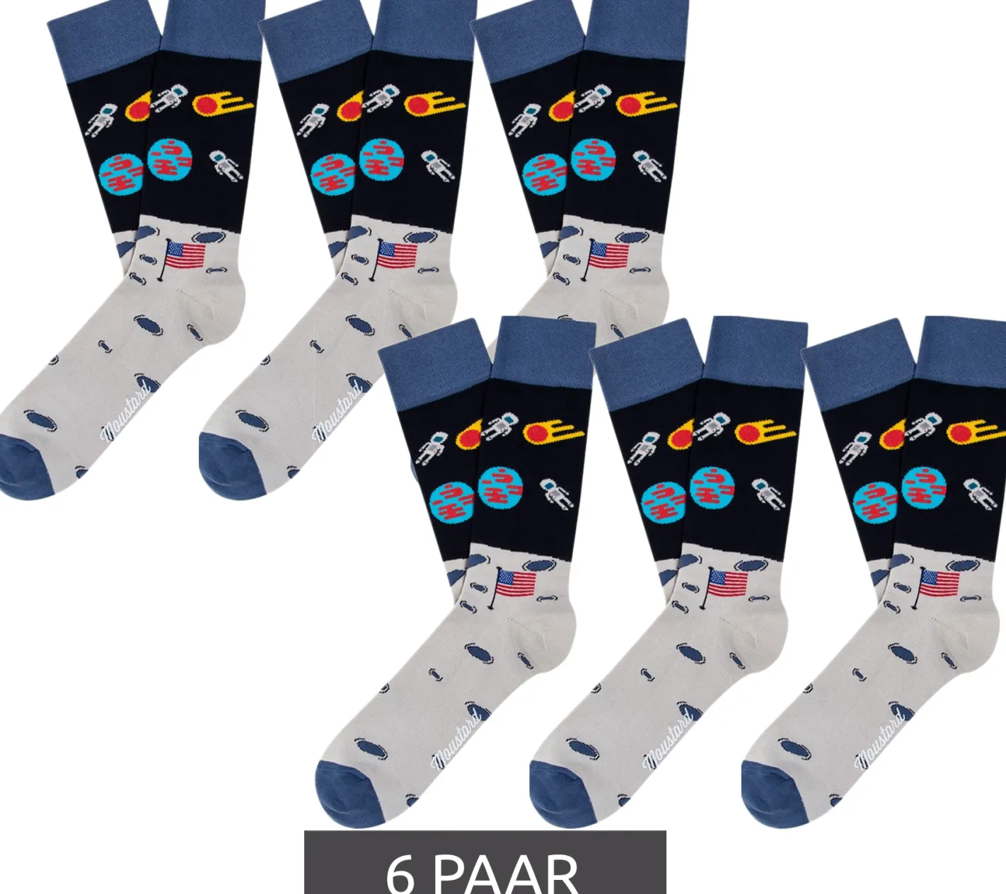 6 Paar Moustard Moon Landing Astronaut Herren Baumwoll-Socken mit Weltraum Print gemusterte lange Strümpfe 17S-MOON Hellblau/Grau