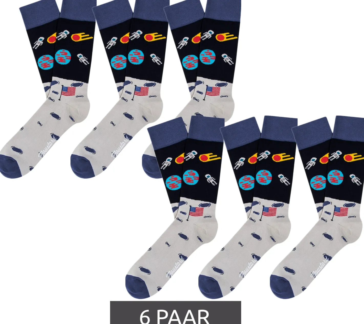 6 Paar Moustard Moon Landing Astronaut Herren Baumwoll-Socken mit Weltraum Print gemusterte lange Strümpfe Dunkelblau/Grau