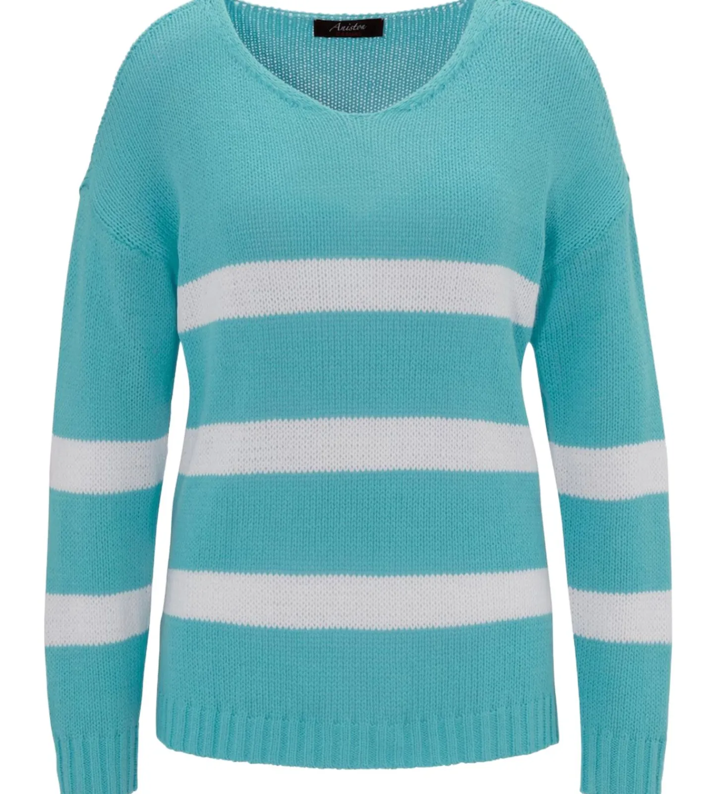 Aniston CASUAL Damen Strick-Pullover mit Baumwollanteil Alltags-Pullover Langarm-Shirt 78647339 Türkis/Weiß
