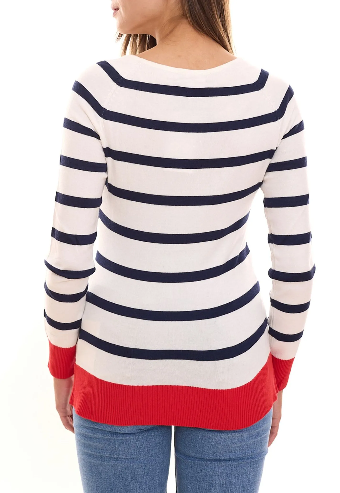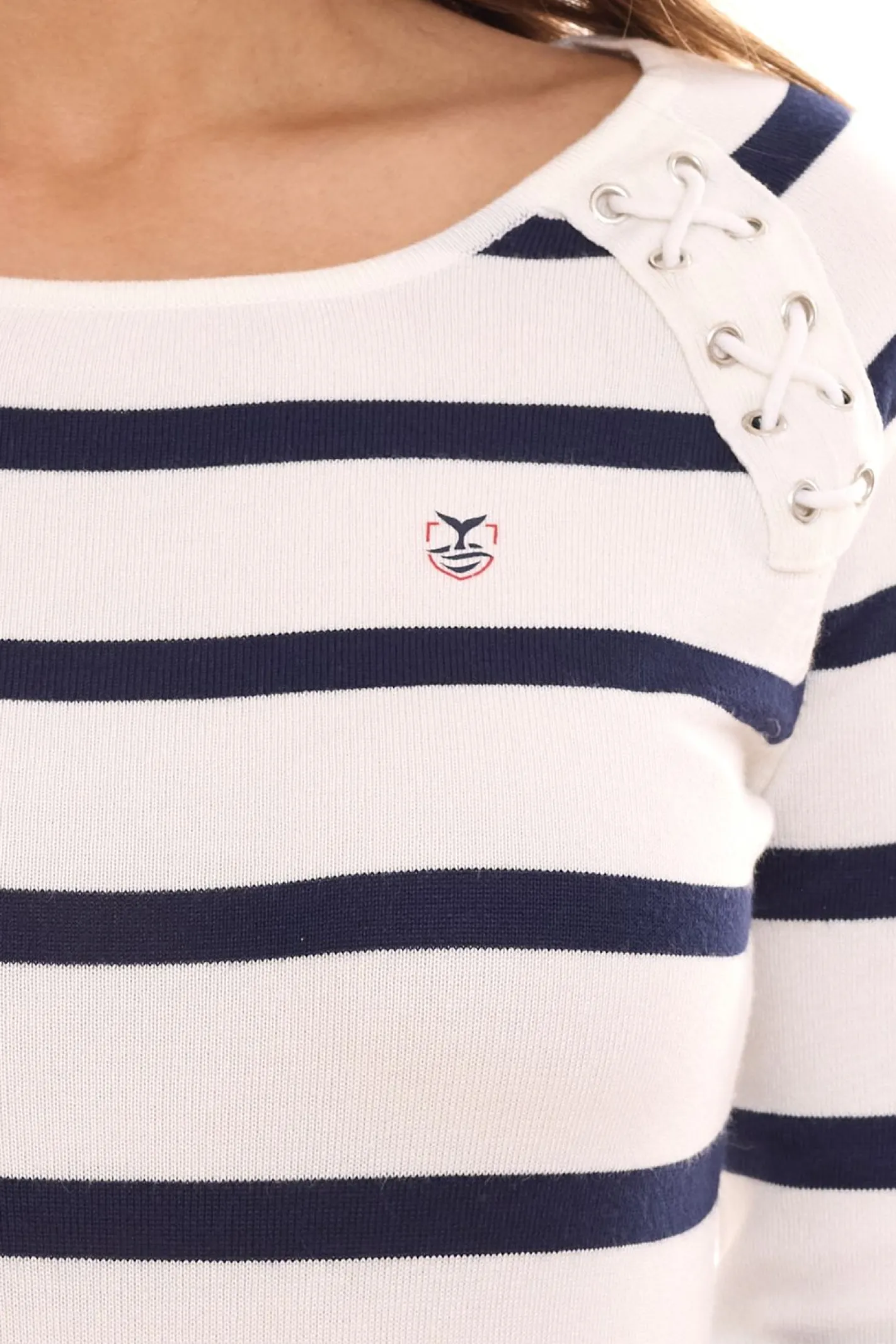 DELMAO Damen Langarm-Shirt gestreiftes Rundhals-Sweatshirt mit Schnürung oder Knöpfen Blau/Weiß/Rot oder Blau/Weiß