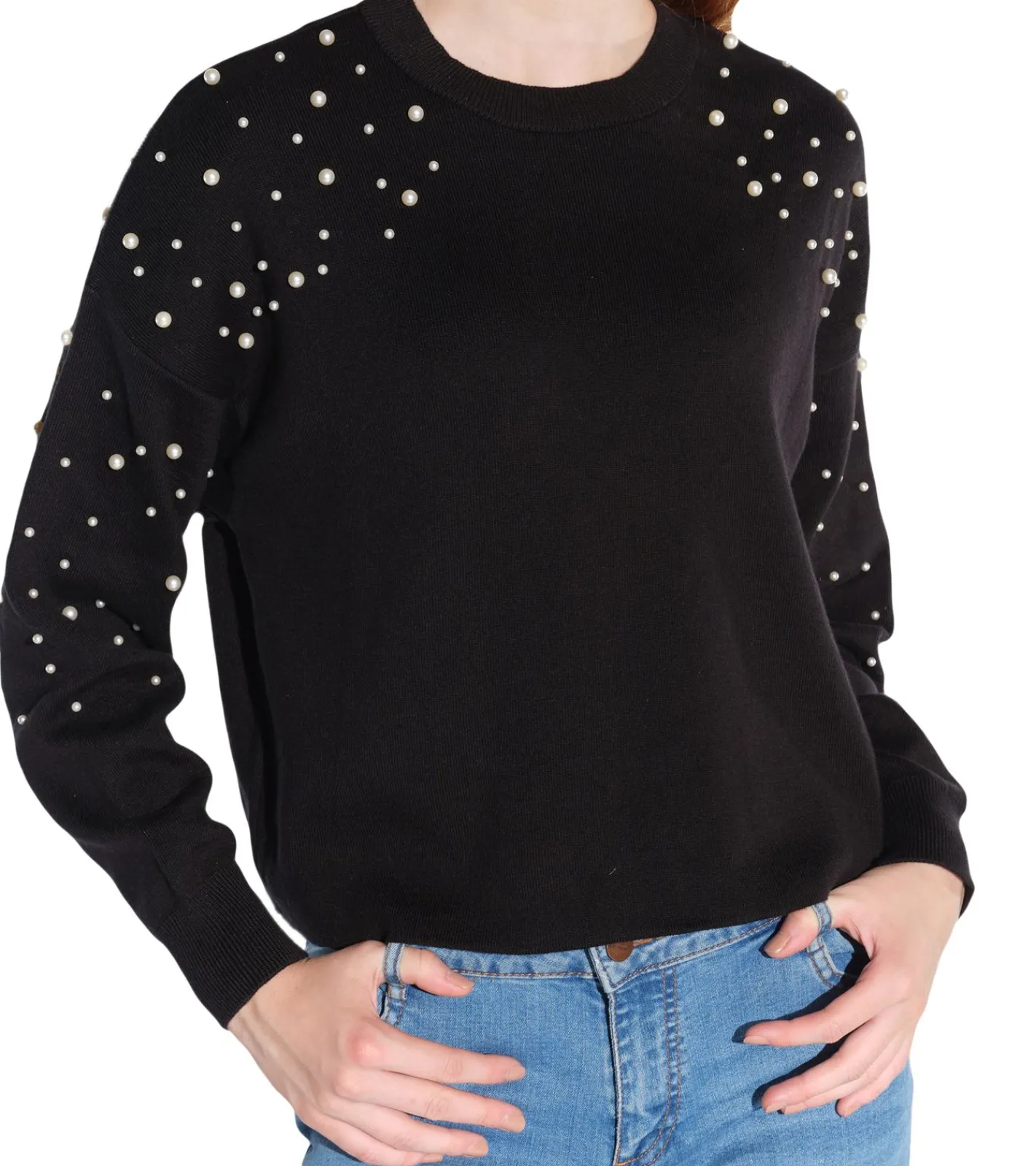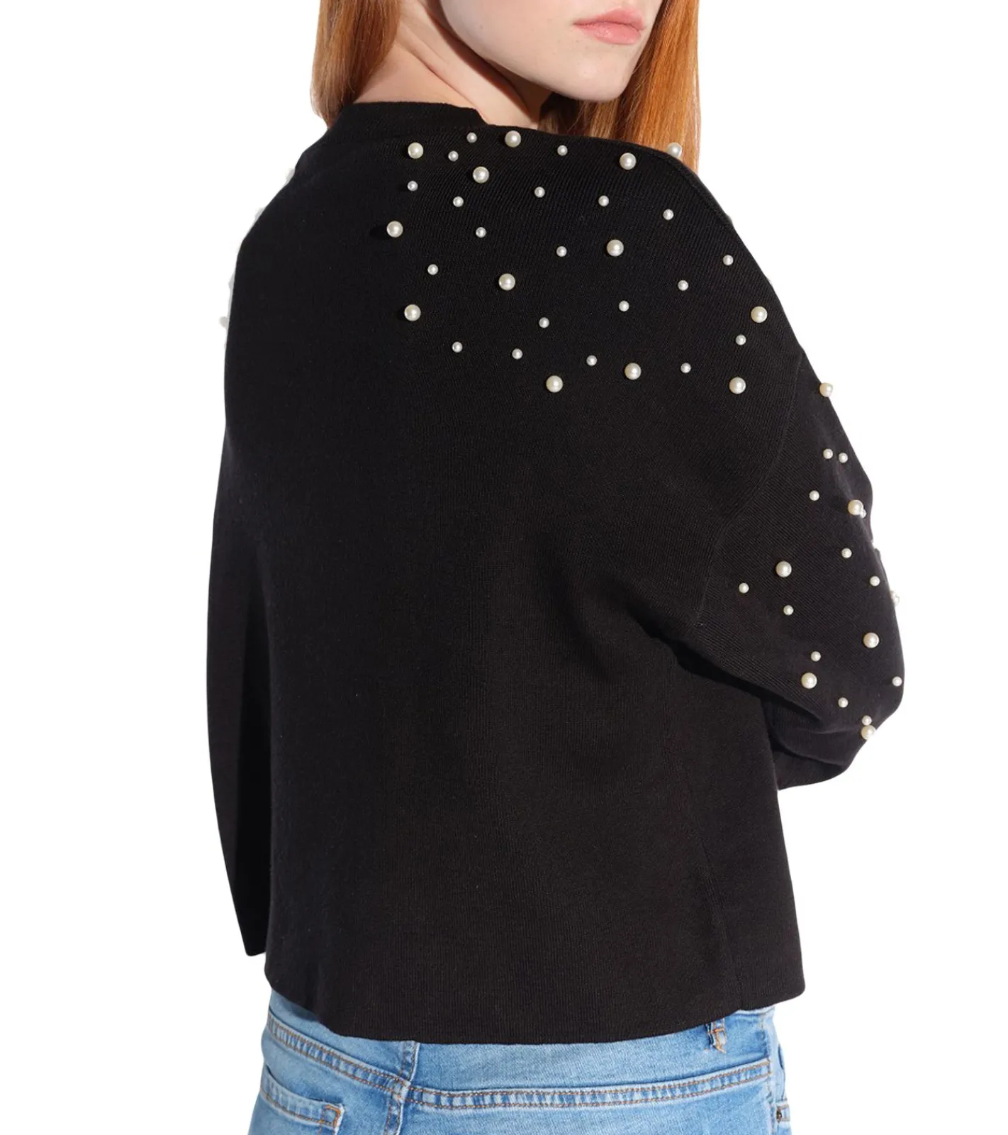 vestino Damen kurzer Strick-Pullover mit Baumwollanteil Cropped-Pullover mit Perlen Sommer-Sweater 901148 Schwarz