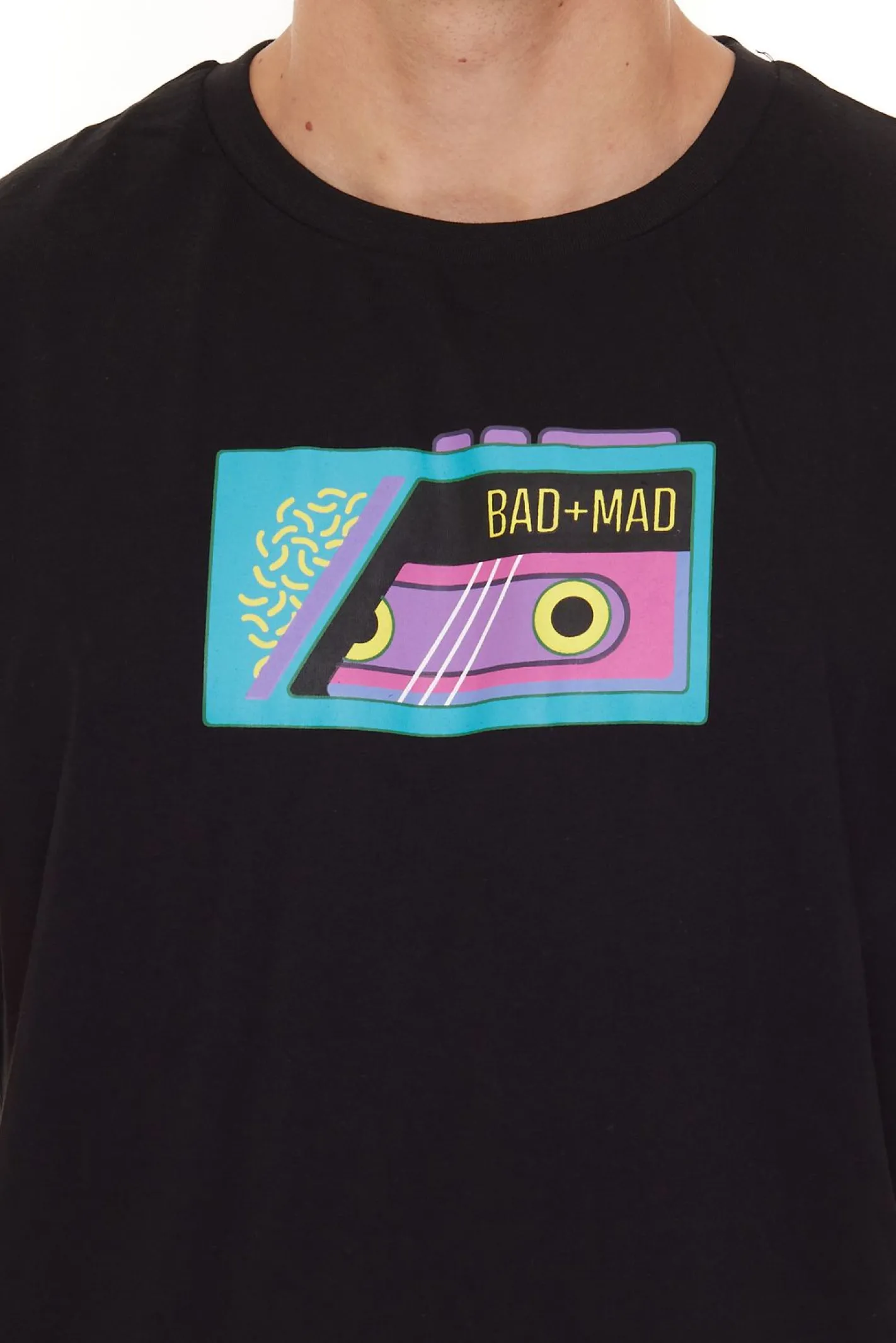 BAD+MAD Tokio Tee Herren Baumwoll-T-Shirt mit buntem Kasetten-Print Rundhals-Shirt BMTR004 Schwarz