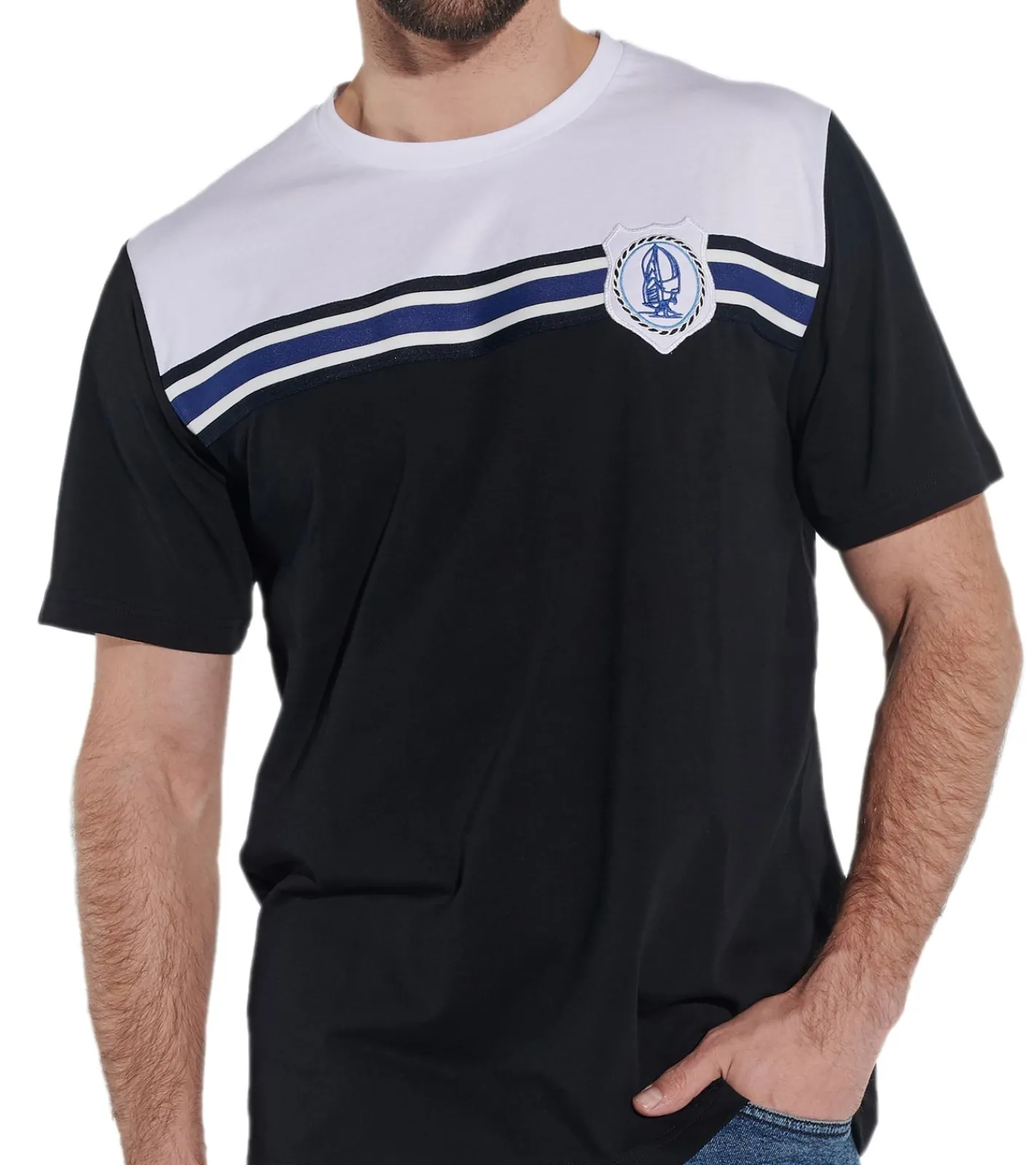 COURSE Herren T-Shirt mit Kontrastpasse und Streifenband Baumwoll-Shirt mit maritimen Badge 900110 Schwarz/Weiß