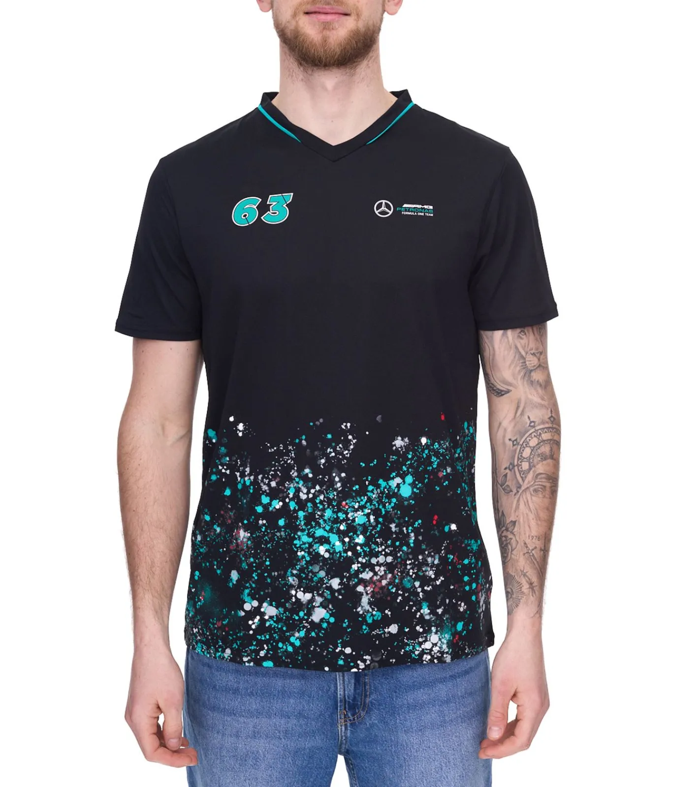 Mercedes-Benz AMG Petronas F1 MAPF1 FW George Russell #63 Sports Herren Basic T-Shirt mit Farbspritzer-Druck Baumwoll-Shirt 701220863 001 Schwarz