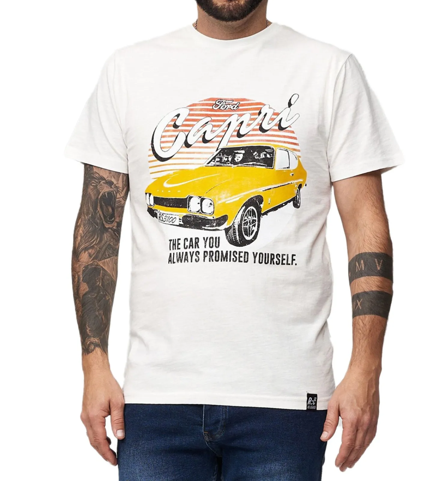 RE:COVERED X MUSTANG Herren T-Shirt mit Ford MUSTANG-Print Baumwoll-Shirt Rundhals-Shirt MMFRD386 Ecru-Weiß