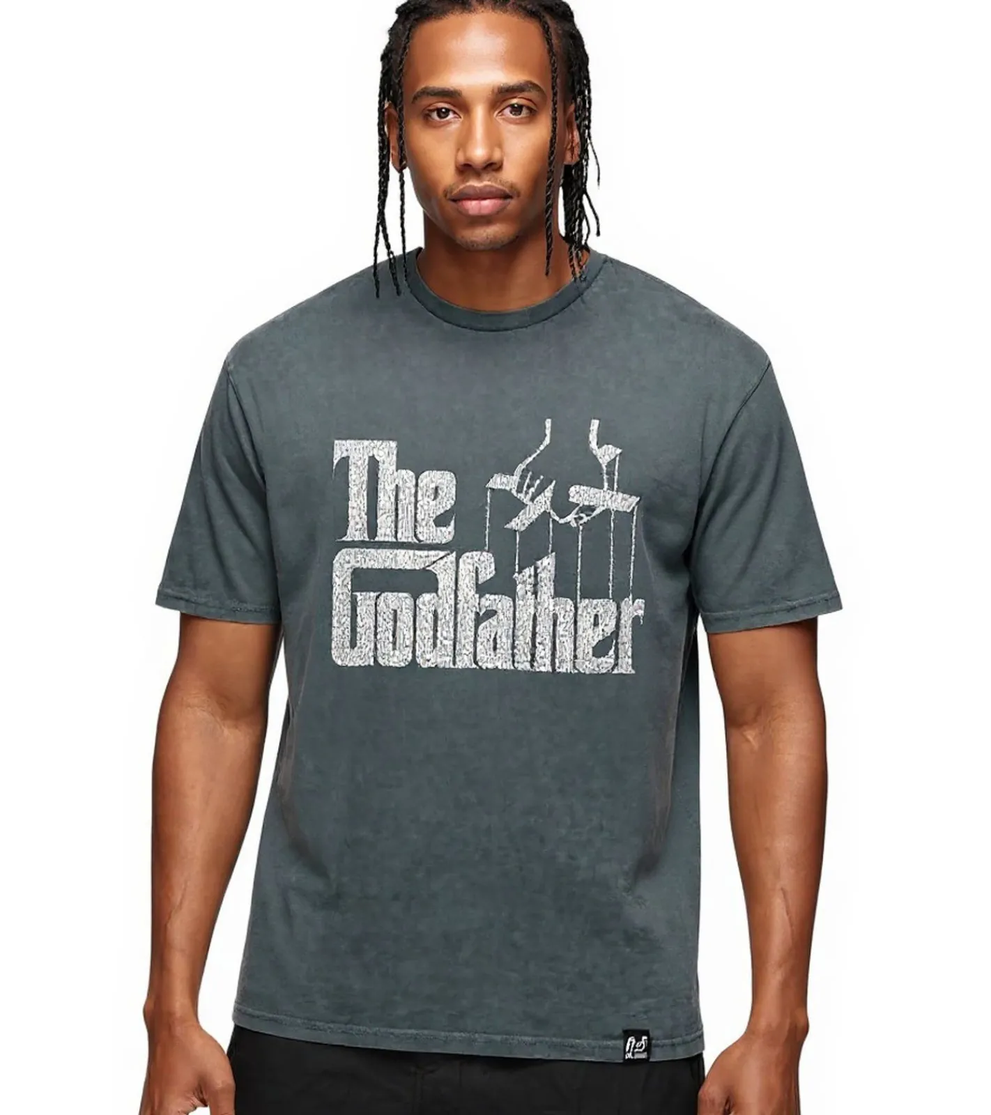 RE:COVERED X The Godfather Herren Baumwoll-Shirt mit großem Schriftzug-Print Kurzarm-Shirt MMVCM274 Grau