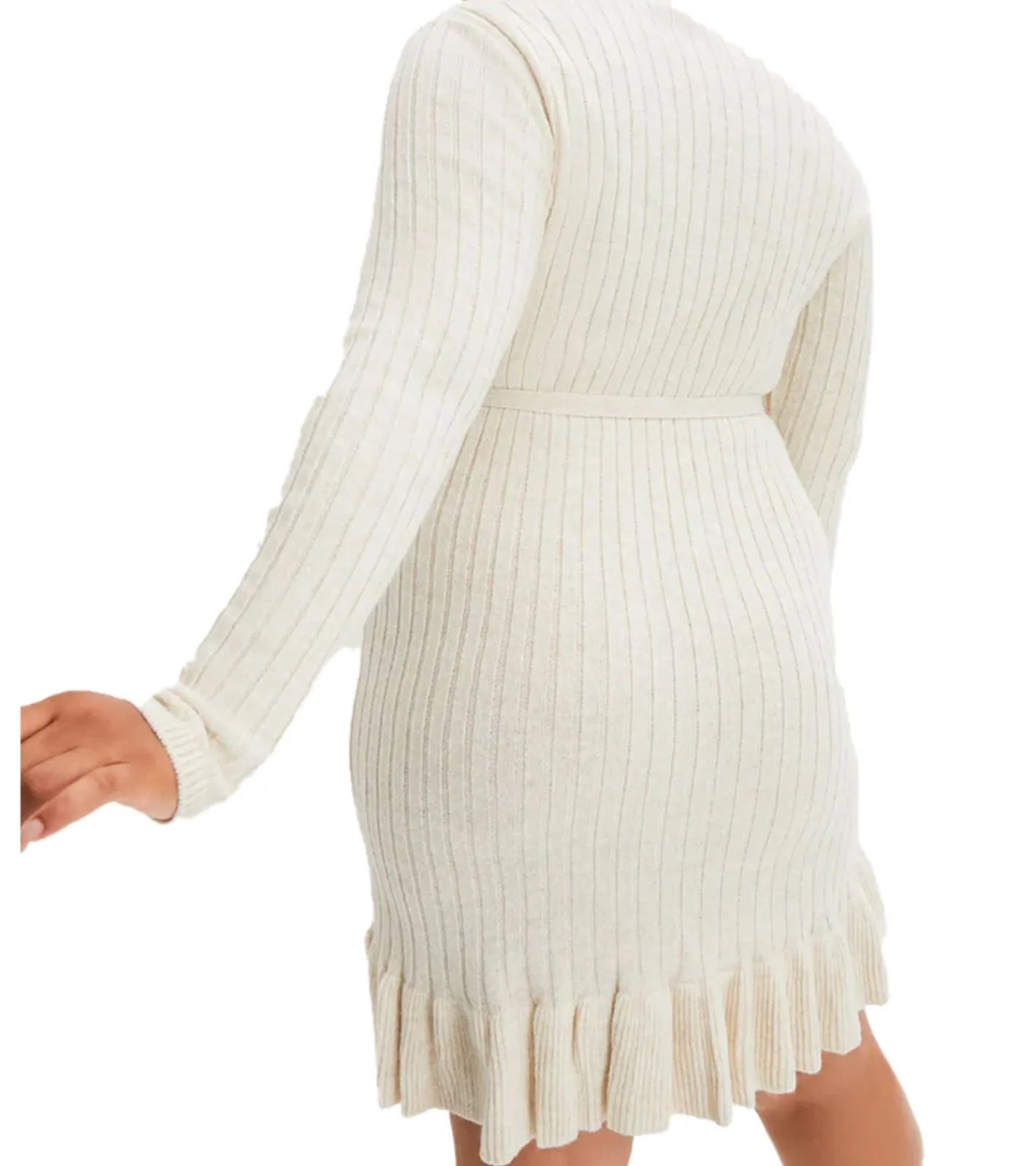 Damen Strick-Kleid Mini-Kleid mit Volant und Zierschnalle Langarm-Kleid Große Größen 924580 Creme meliert