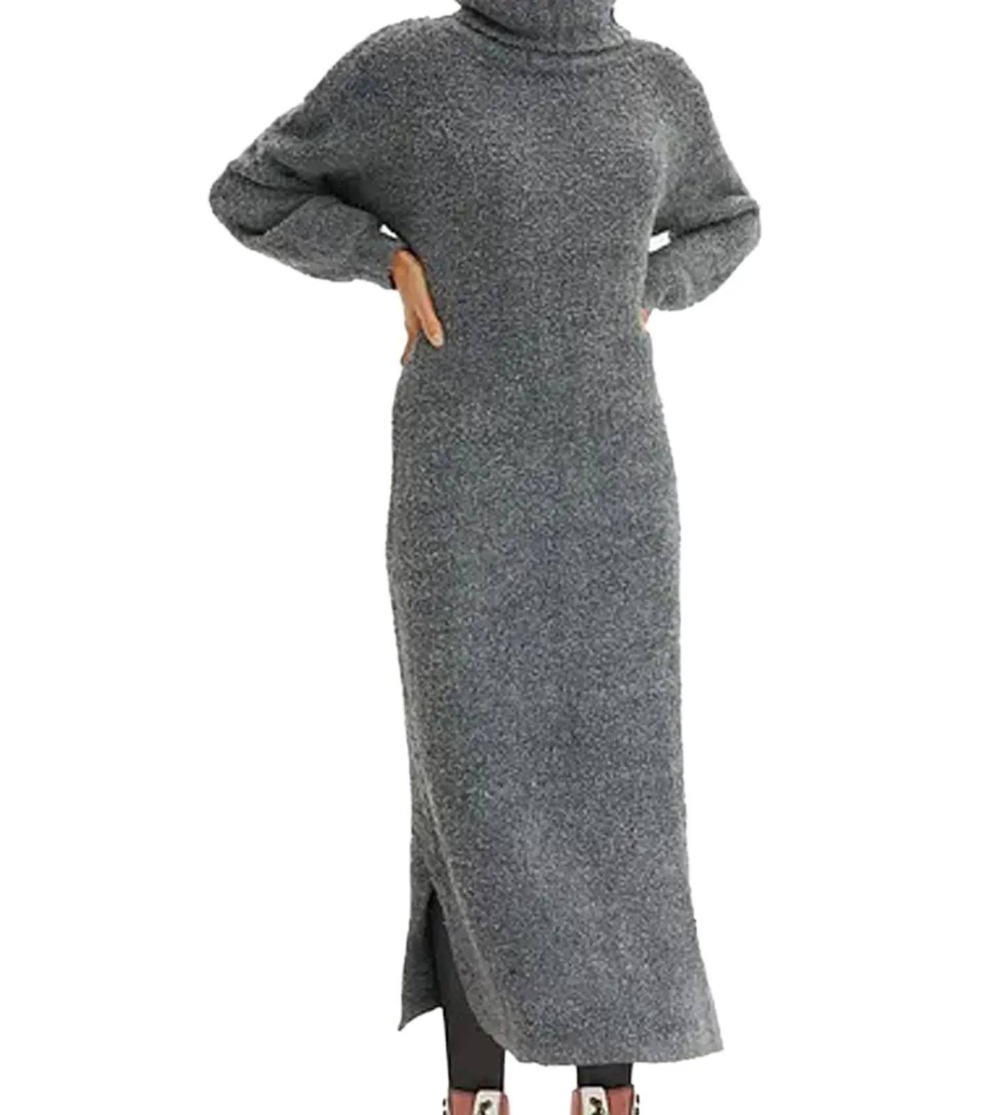 weiches Damen Midi-Kleid Basic-Kleid aus Boucle-Garn Langarm-Kleid 935820 Größe Größen Grau