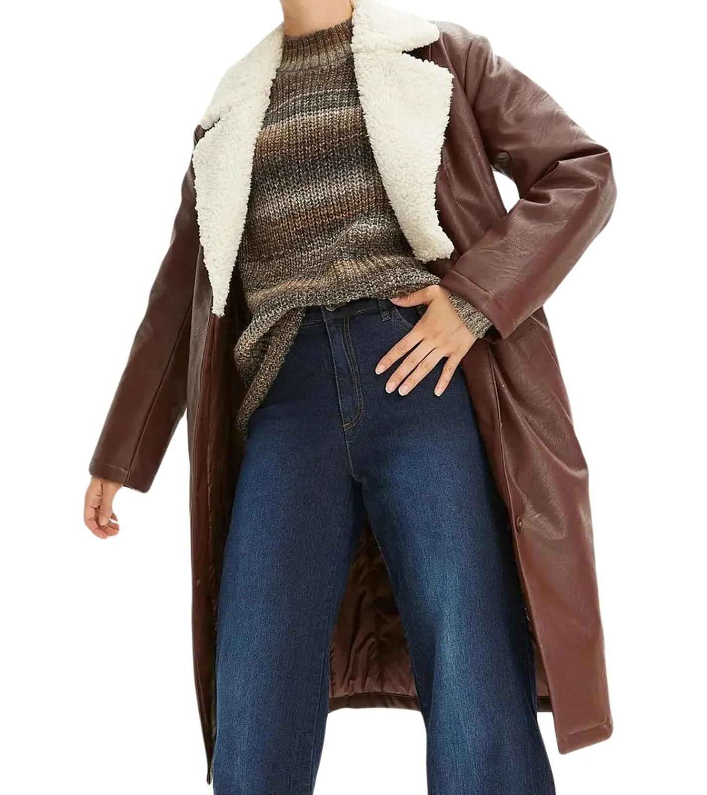 Damen Lederimitat-Mantel mit Teddyfell Kragen Oversized Alltags-Mantel Langarm-Jacke Übergangs-Jacke 915415 Dunkelbraun/Creme