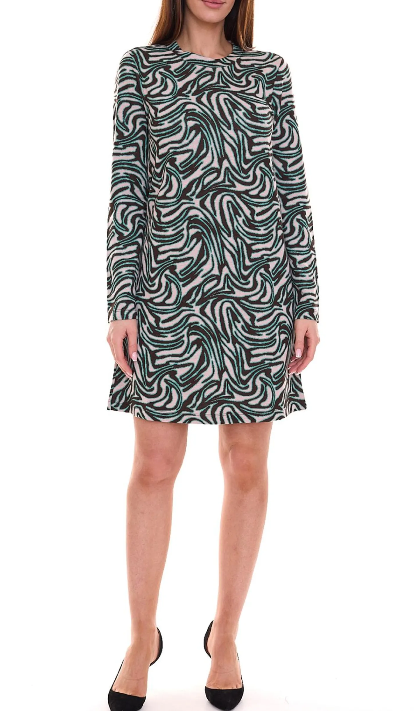 Aniston SELECTED Damen Mini-Kleid mit Allover-Print Langarm-Kleid 88938605 Schwarz/Grün/Beige