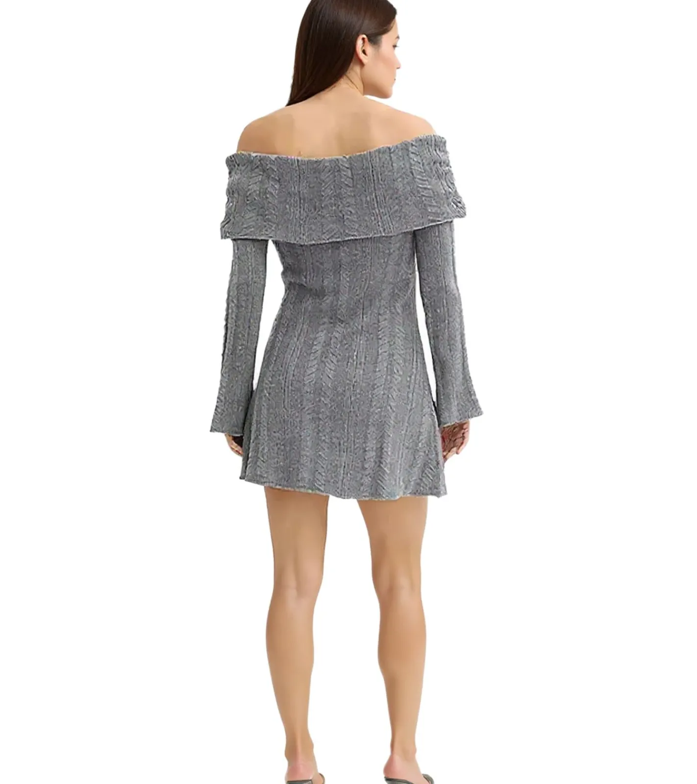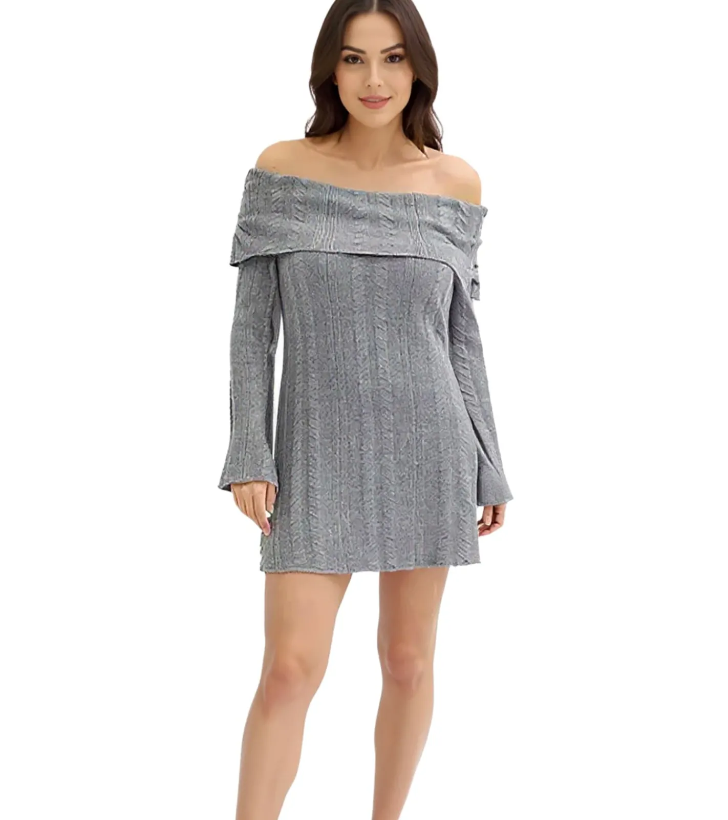 Damen Strick-Kleid mit Bardot-Ausschnitt Mini-Kleid Schulterfrei 912333 Grau
