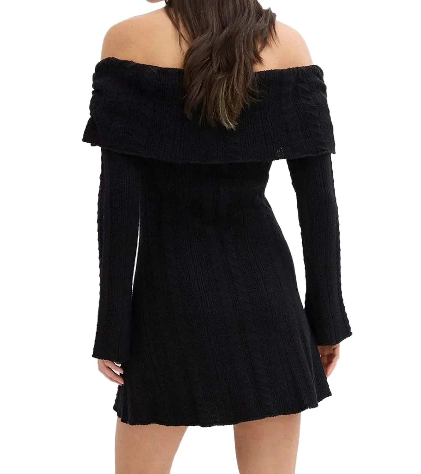 Damen Strick-Kleid mit Bardot-Ausschnitt Mini-Kleid Schulterfrei 970506 Schwarz