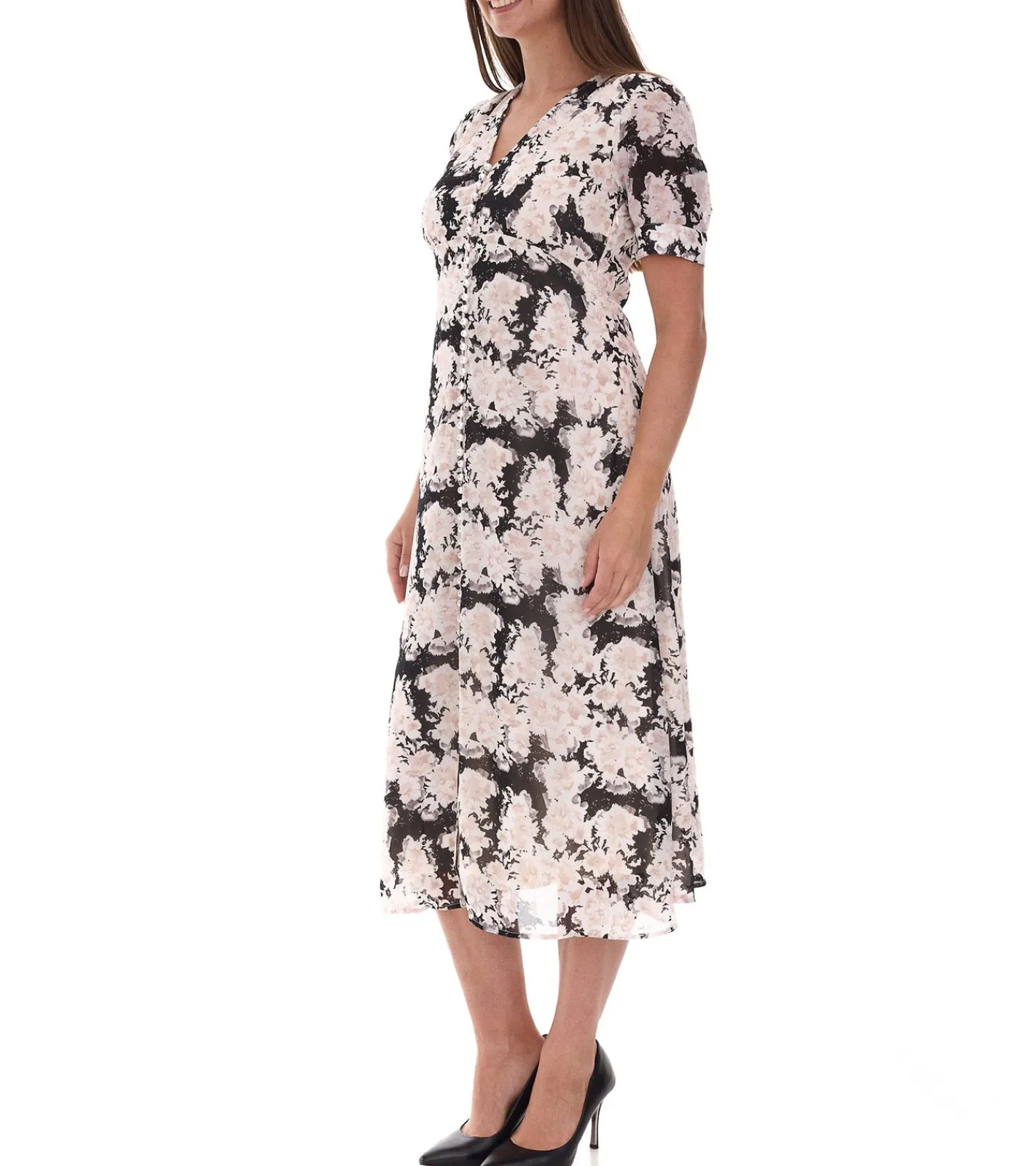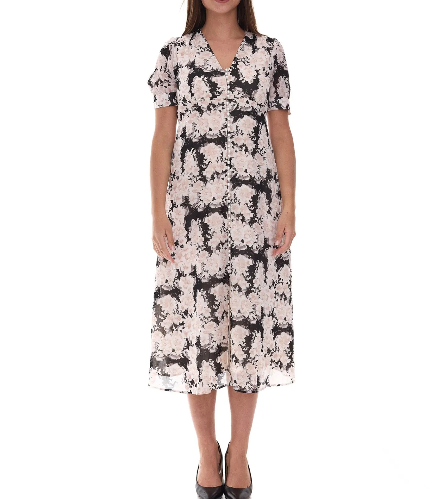 florales Damen Sommer-Kleid aus recyceltem Material knielanges leichtes Chiffon-Kleid mit Knopfleiste 963798 Weiß/Rosa/Schwarz