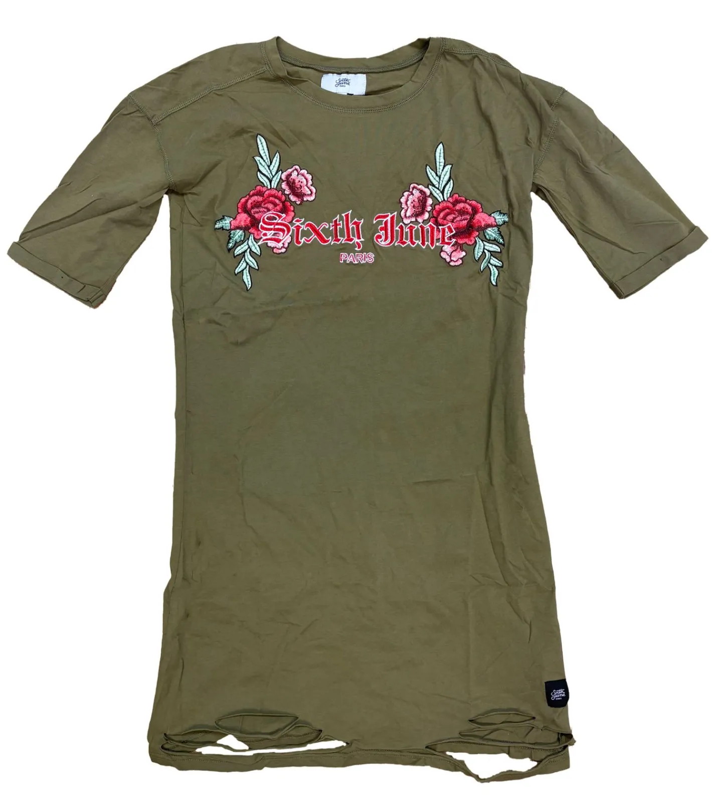 Sixth June Damen Sweat-Kleid Destroyed Baumwoll-Kleid mit Rosen-Print Sommer-Kleid W3177VDR Khaki
