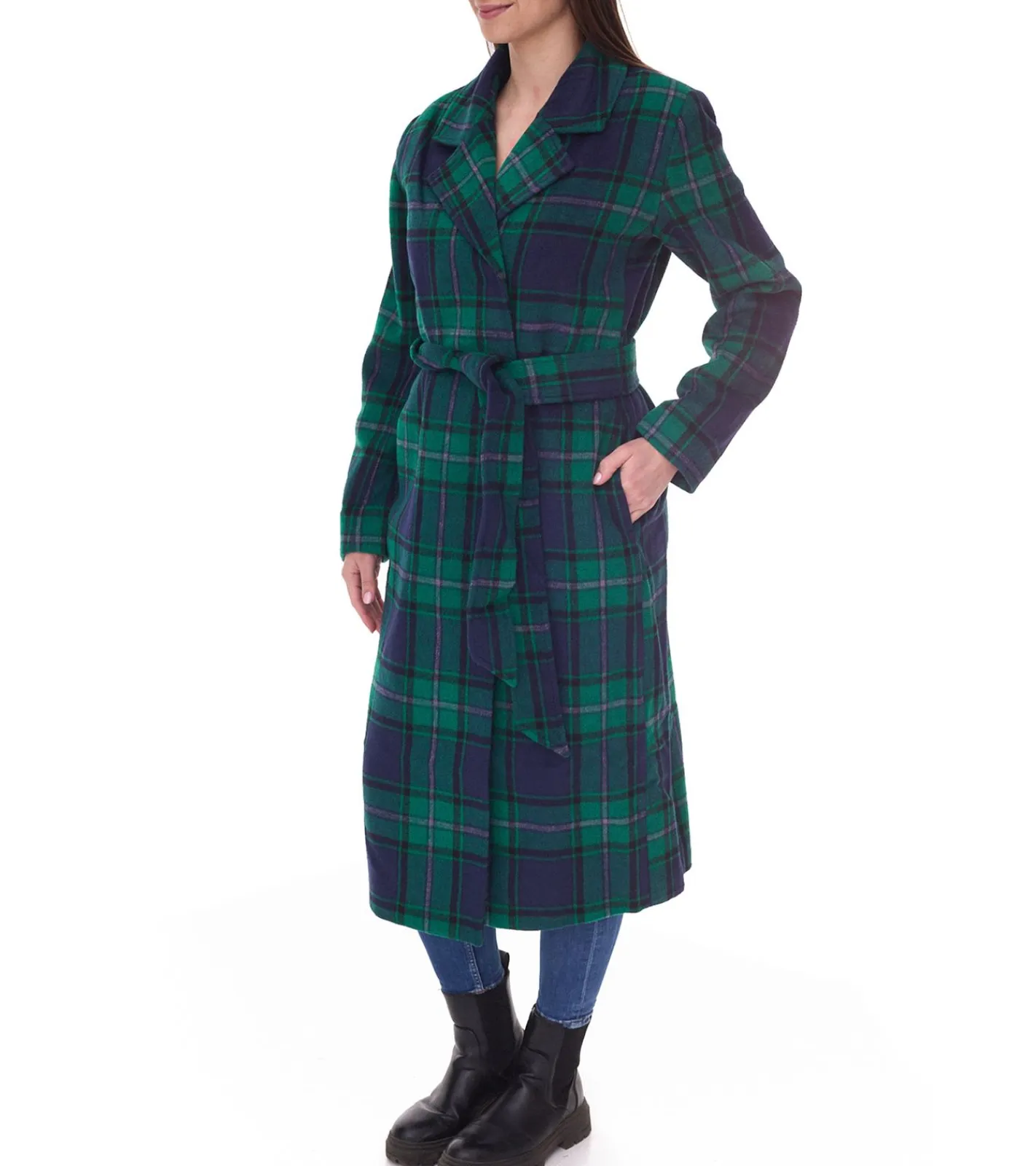DELMAO Damen Mantel karierte Herbst-Jacke mit Reverskragen und Bindegürtel 17844429 Grün/Blau