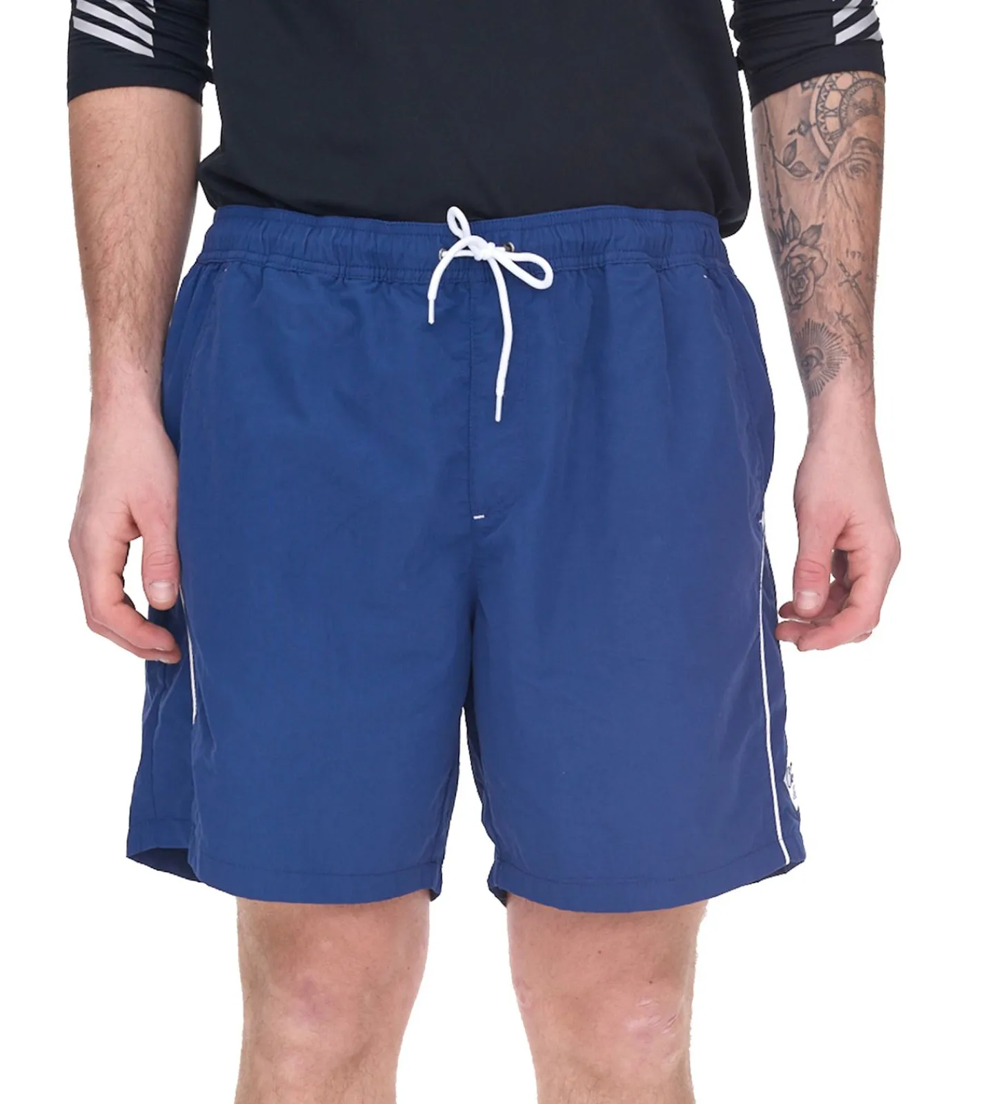 - Farbig abgesetzt erscheinen die wellenförmige Paspel an der Teilungsnaht, der Kordelzug im Bund und das kleine Logobadge mit grafischem Wellenmotiv