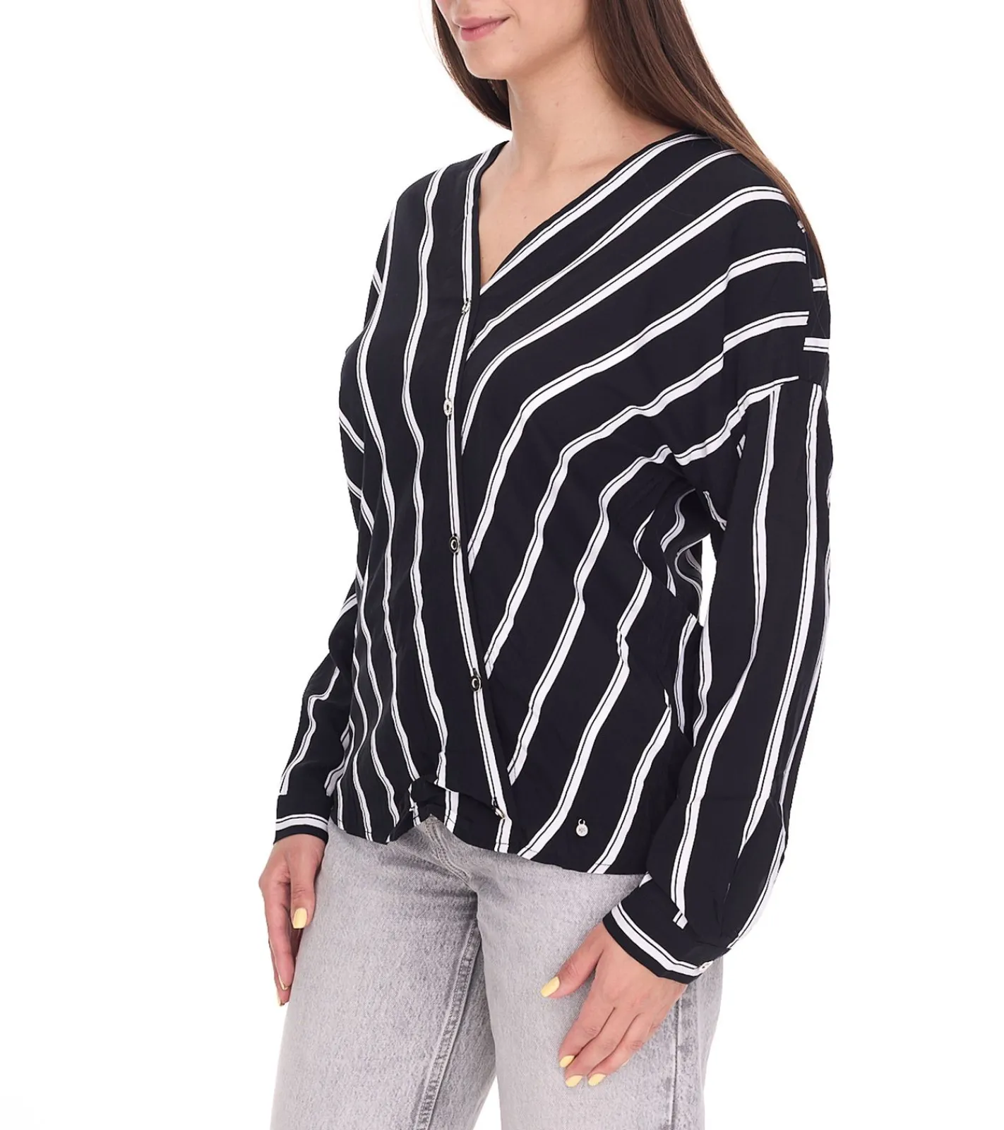 AjC Damen gestreifte Wickelbluse leichte Sommer-Bluse Freizeit-Bluse mit Knopfleiste 29937205 Schwarz/Weiß