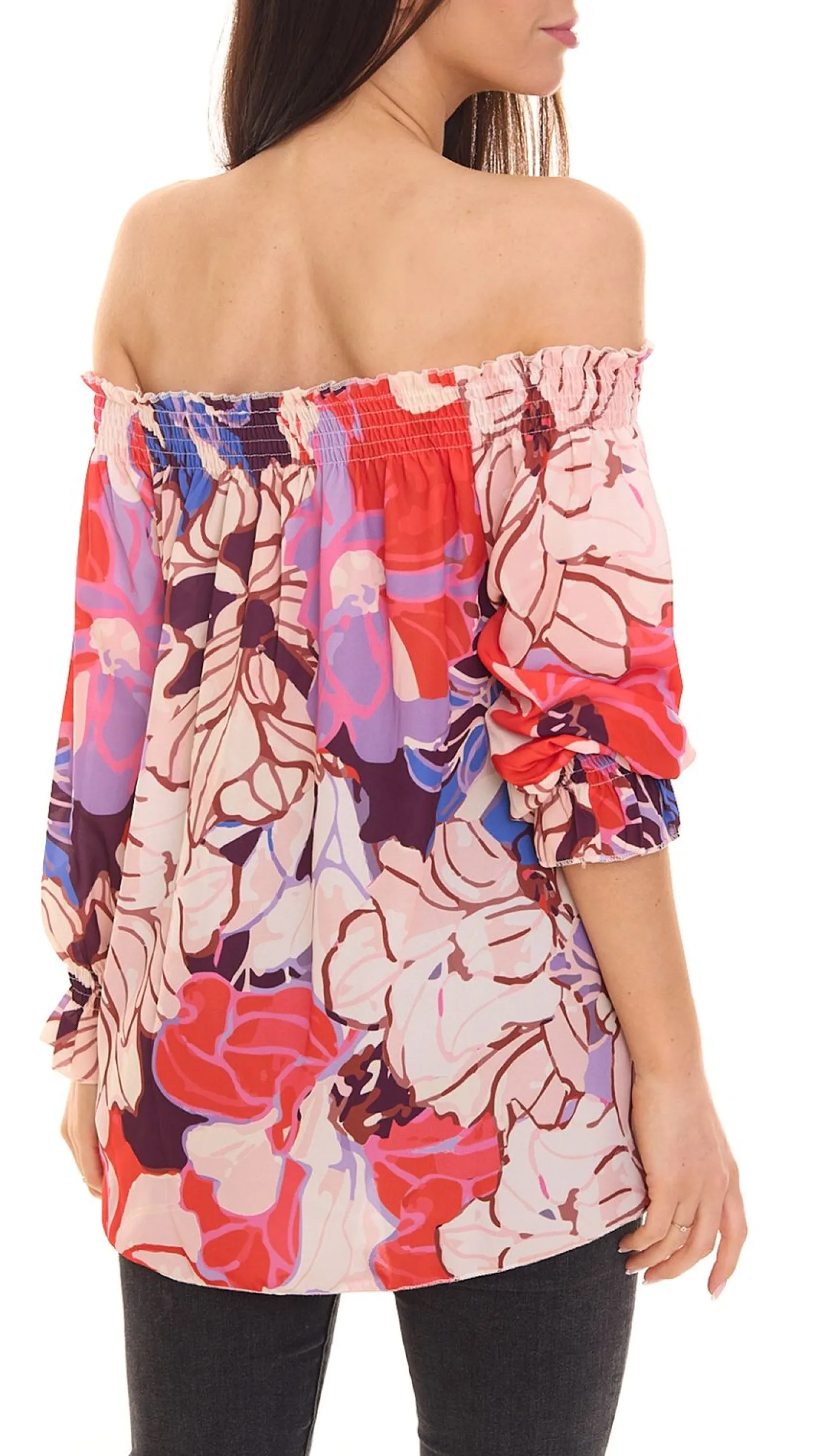 - schulterfreier Ausschnitt mit Gummizug und Raffungen