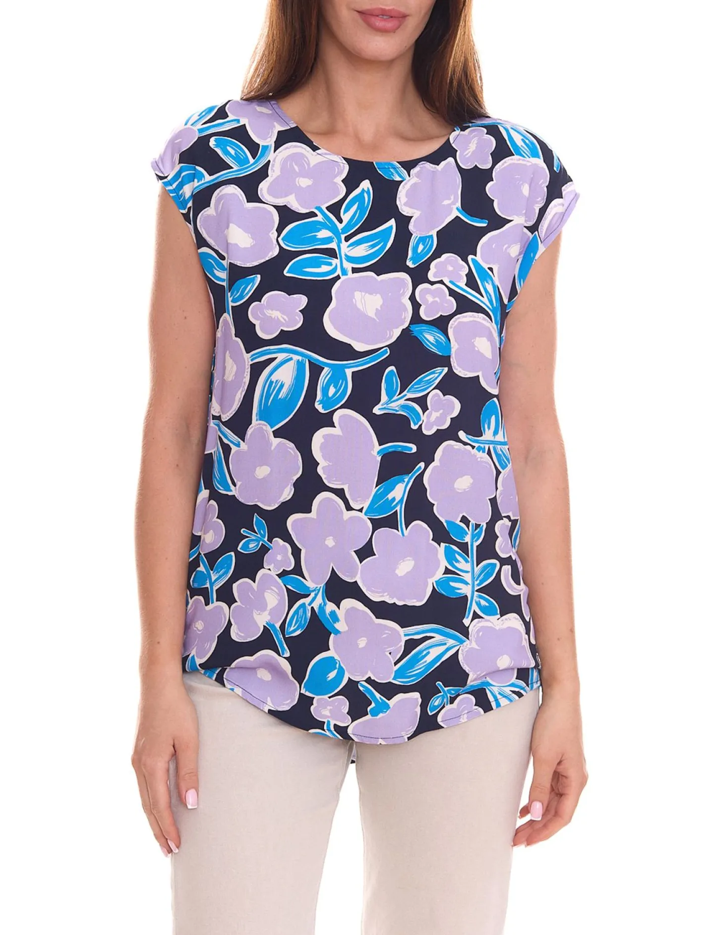 Tamaris Damen Kurzarm-Bluse mit Allover Muster ärmelloses Sommer-Shirt Gelb, Schwarz/Blau oder Blau/Lila