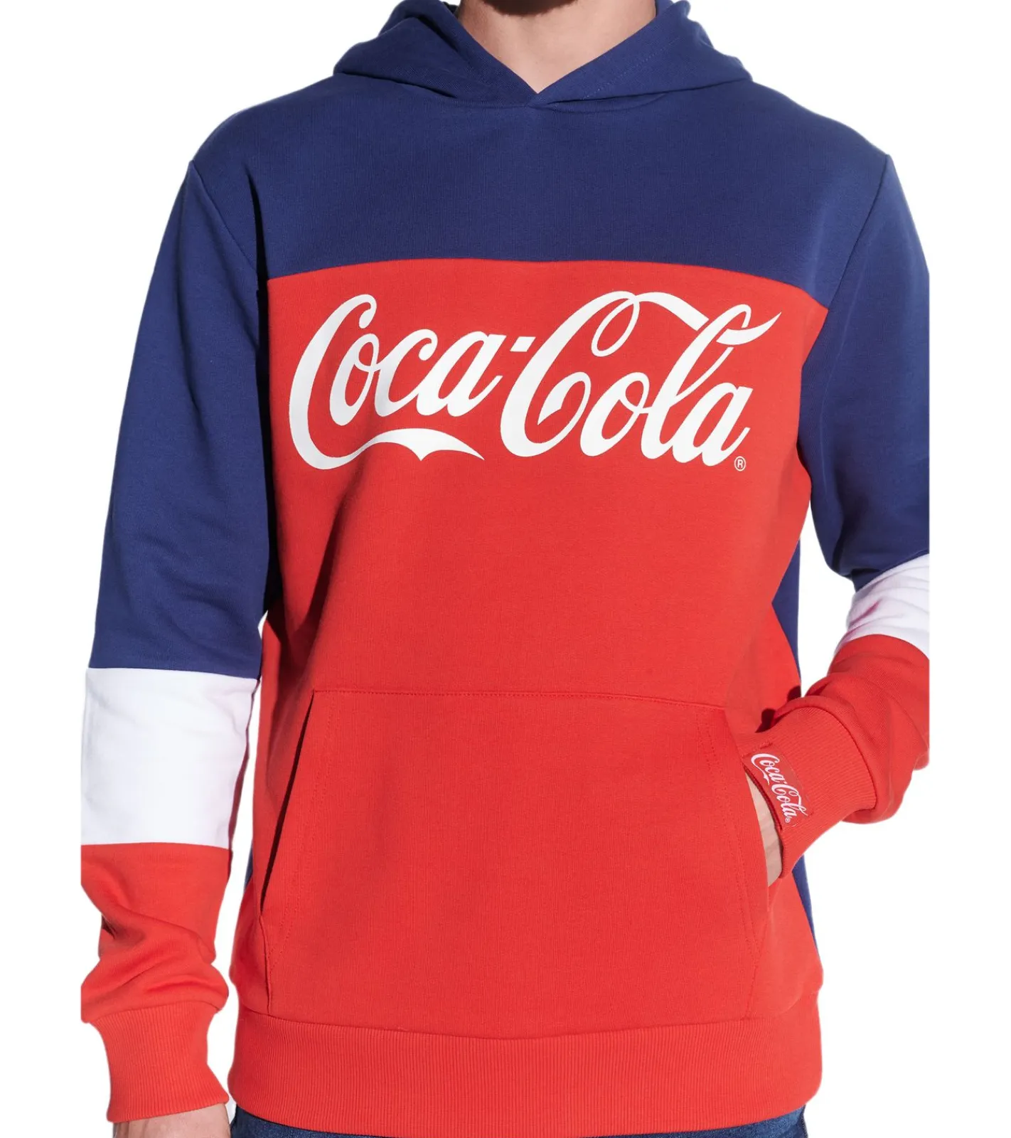 COURSE Coca Cola Herren Hoodie im Color-Blocking-Design Kapuzen-Pullover mit Coca Cola-Print oder Retro Coke-Print Baumwoll-Sweater Blau/Rot/Weiß oder Blau/Weiß