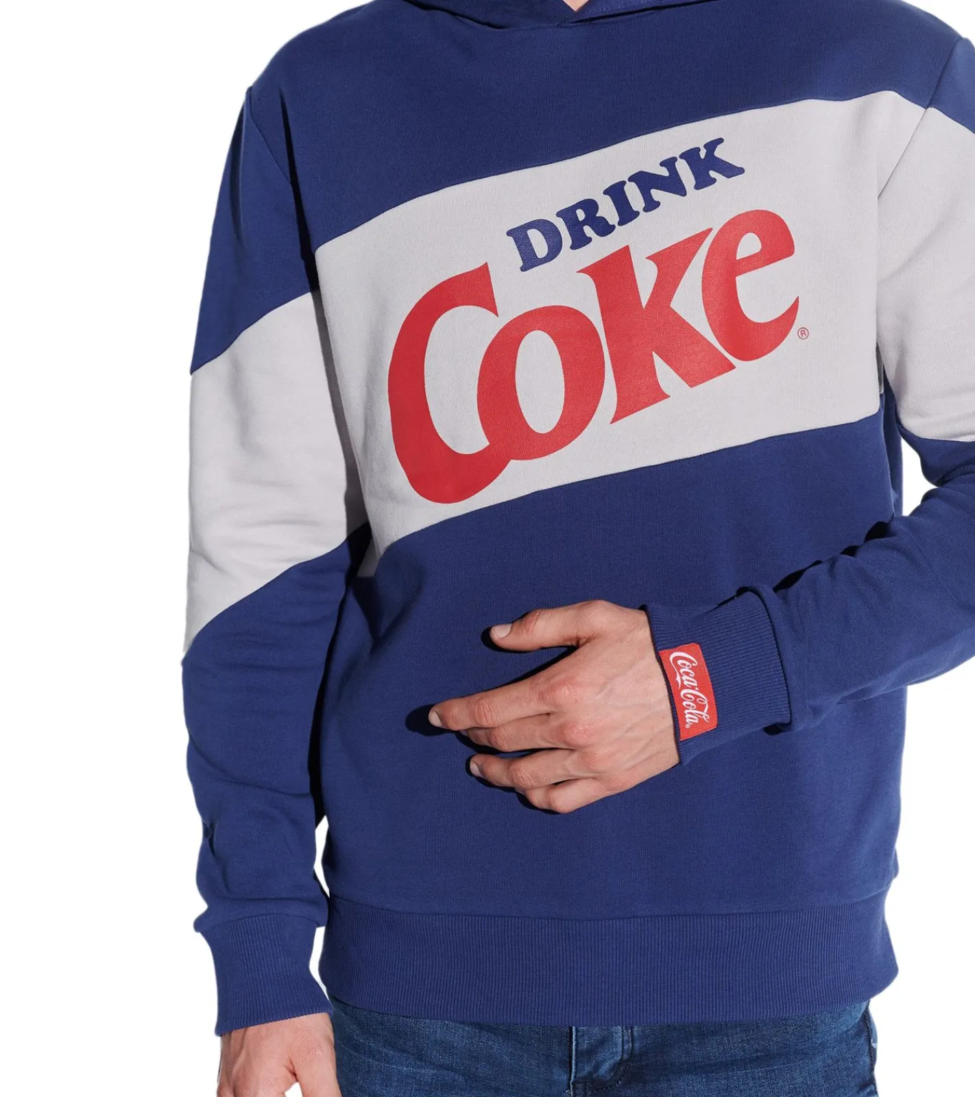 COURSE Coca Cola Herren Hoodie im Color-Blocking-Design Kapuzen-Pullover mit Retro Coke-Print und Patch Baumwoll-Sweater 5015 Blau/Weiß