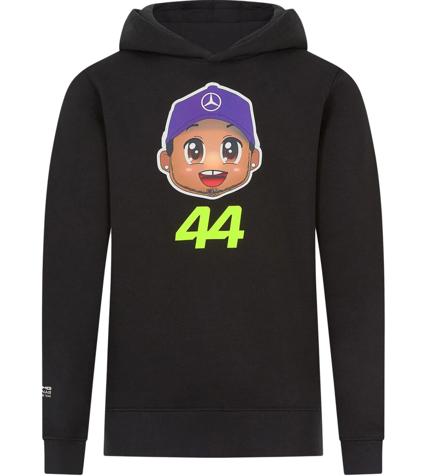 - Für jüngere Lewis-Hamilton-Fans gibt es den Kinder-Hoodie mit einer lustigen Lewis-Karikatur und der Fahrernummer 63 auf der Brust, einem kuscheligen Fleece-Futter und gerippten Bündchen an Ärmeln und Taille