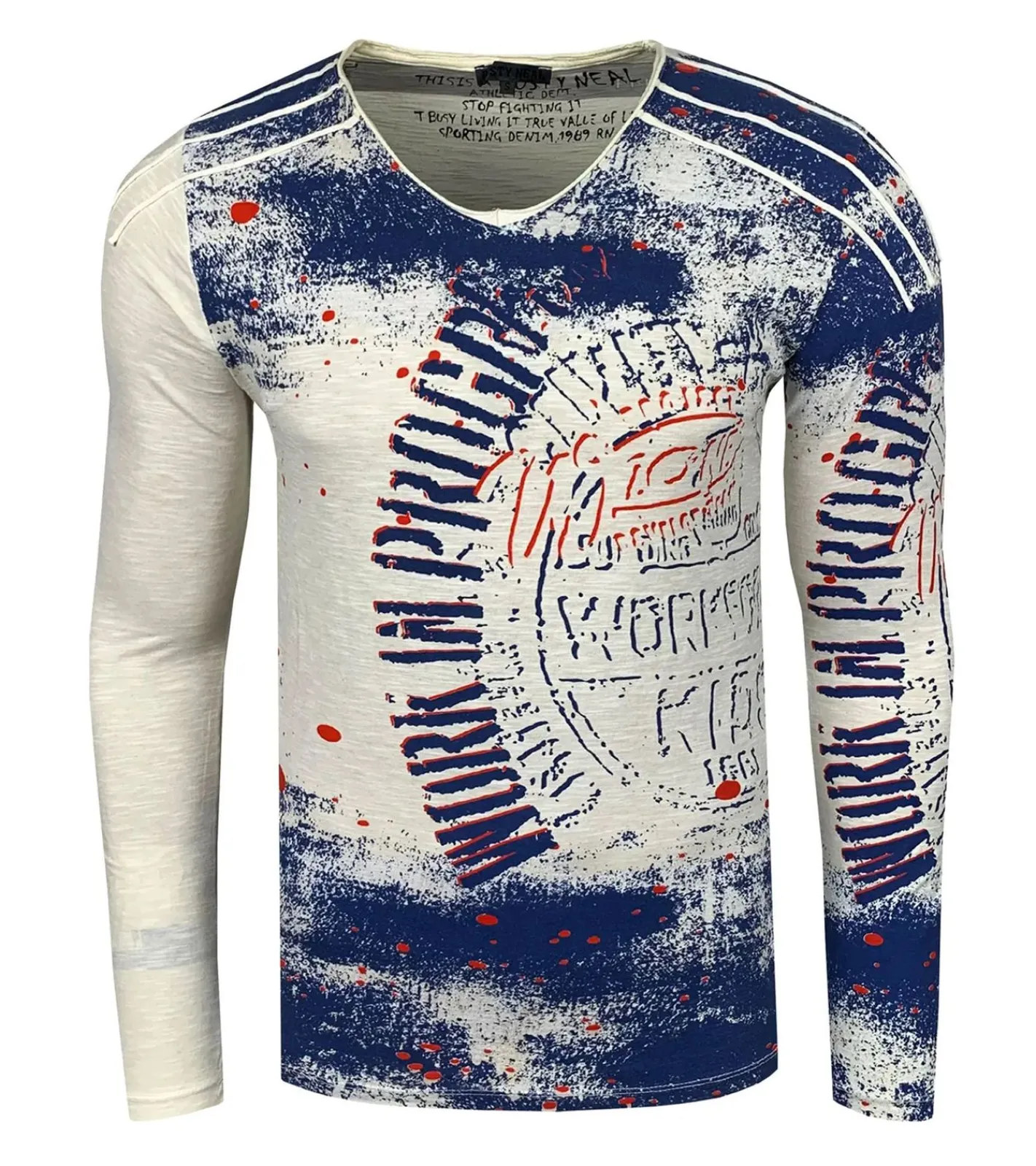 Herren Longsleeve im Vintage-Stil Work in Progress Langarm-Shirt Rundhals Baumwoll-Shirt R-10109 Ecru-Weiß