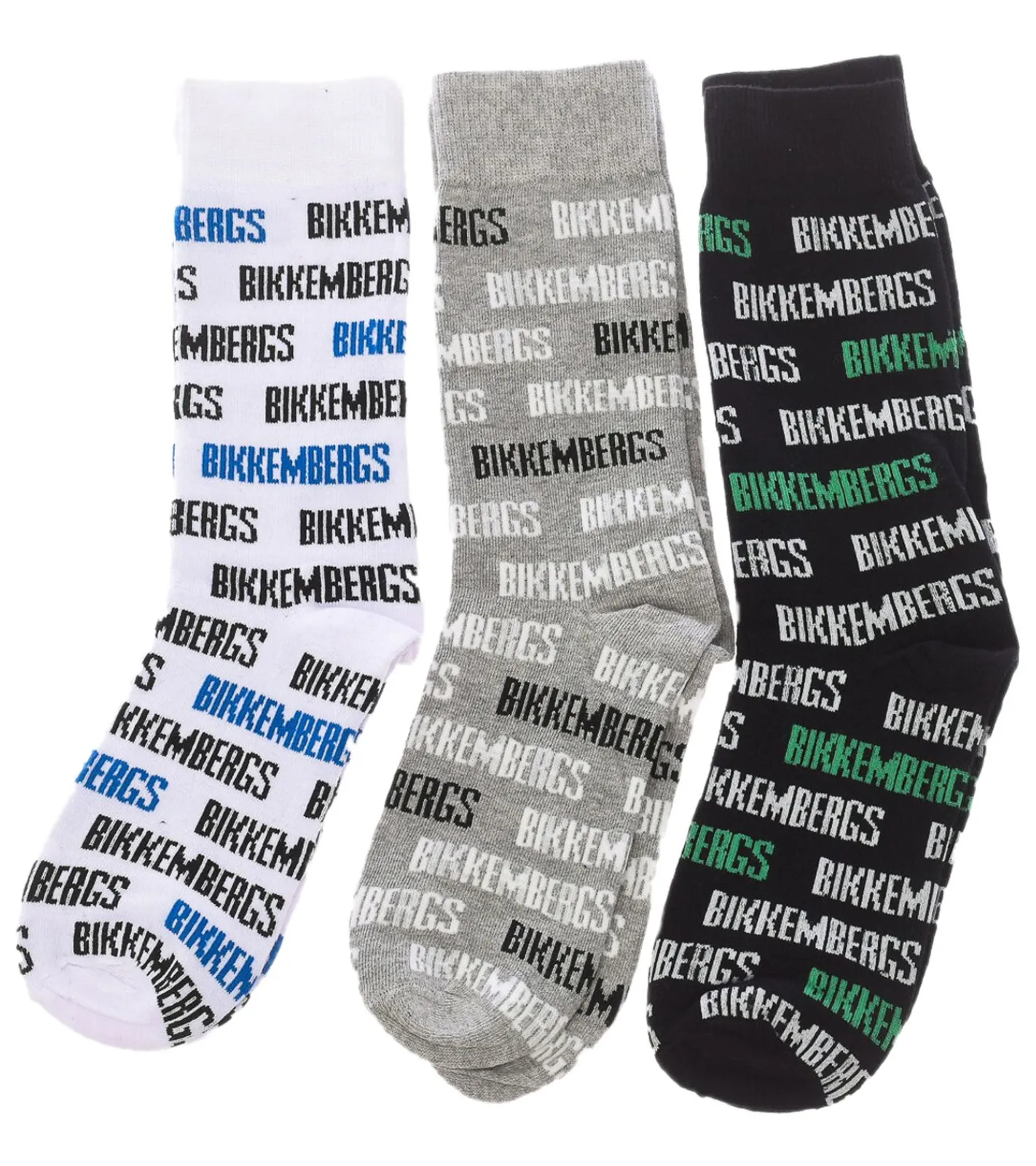 3 Paar BIKKEMBERGS Surtido Herren Tennis-Socken mit Allover Marken-Print Baumwoll-Strümpfe BF_010 Weiß/Schwarz/Grau