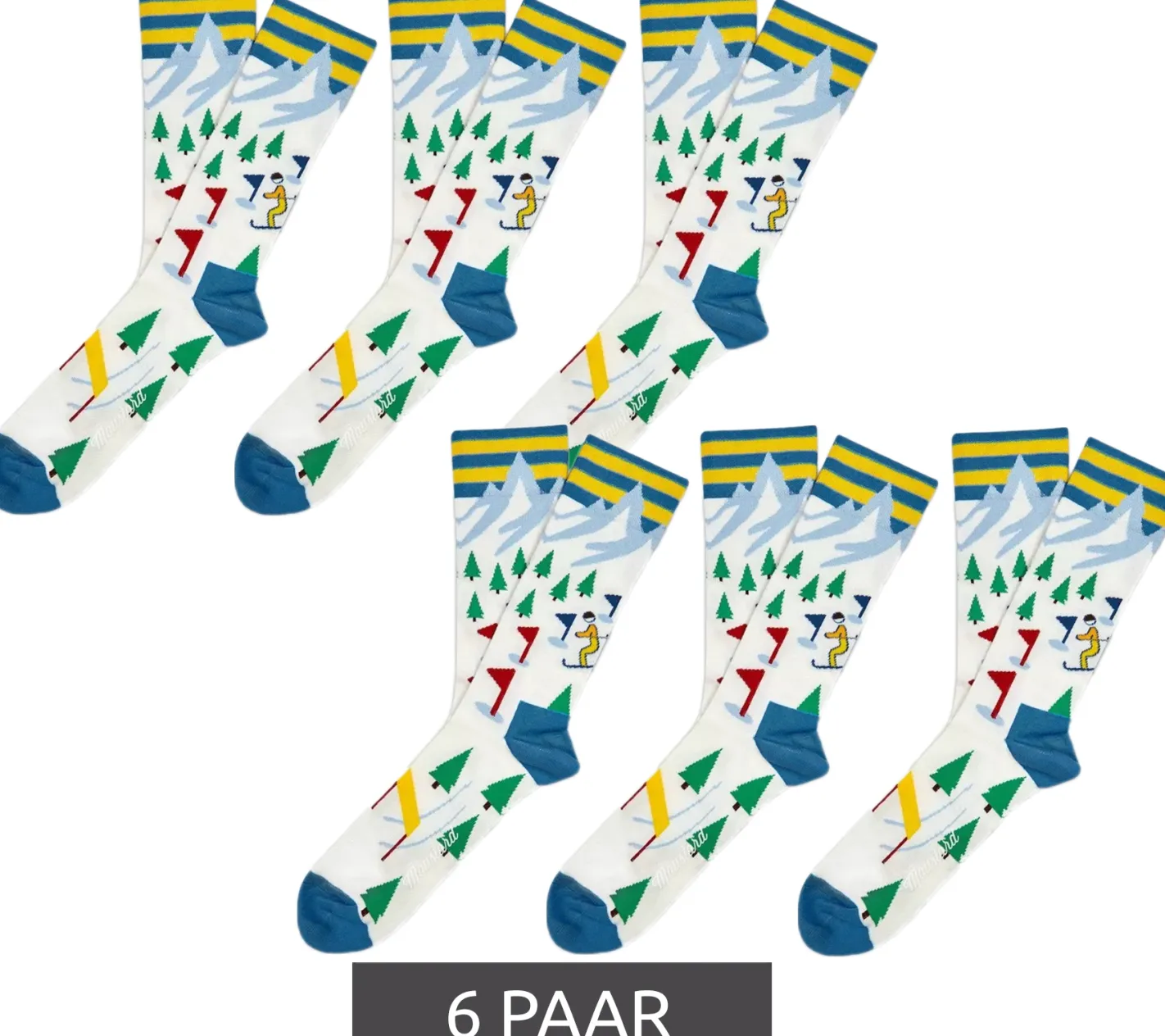 6 Paar Moustard Ski Herren Baumwoll-Socken mit Skipisten-Print gemusterte lange Strümpfe 17S-SKI_02 Weiß/Dunkelblau/Rot/Grün