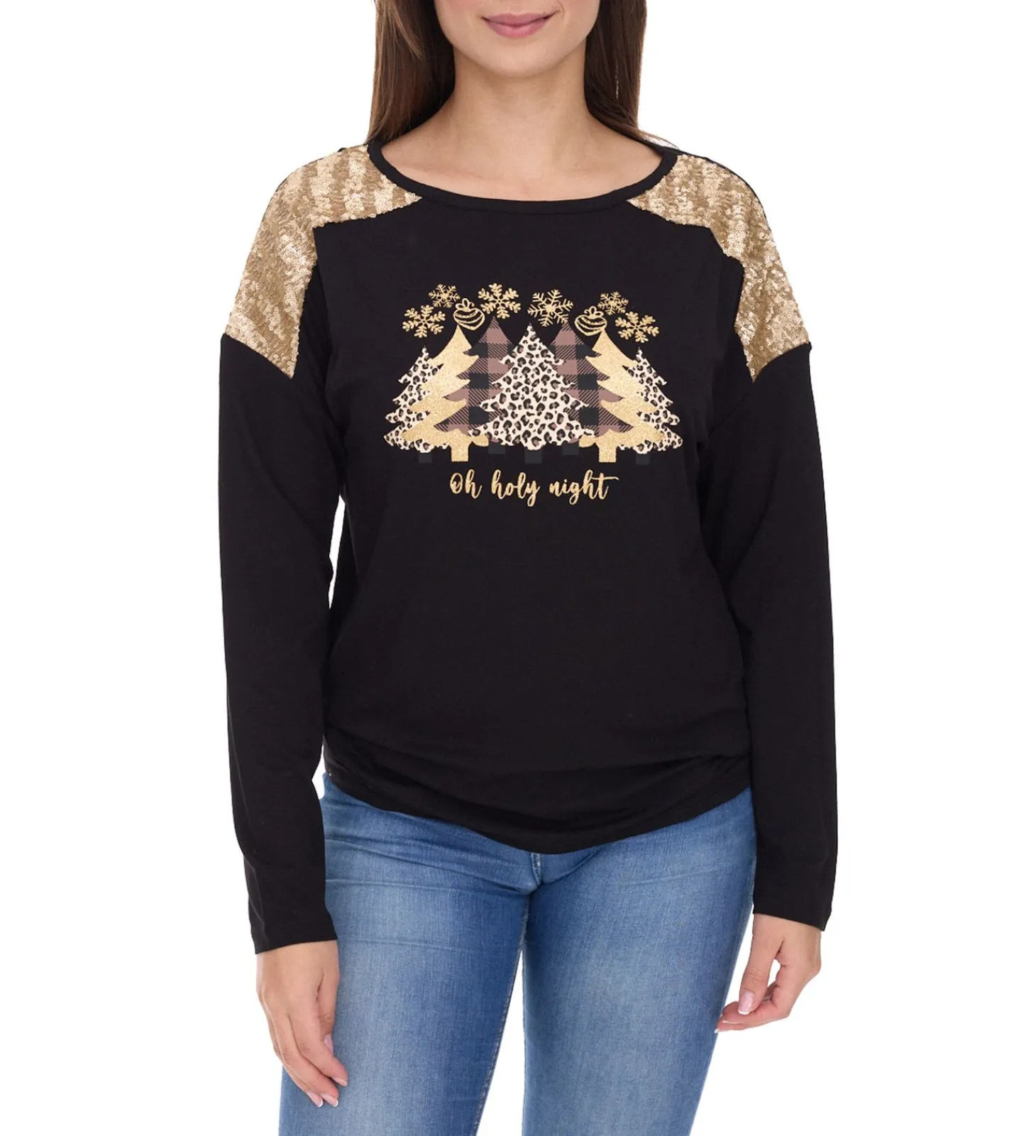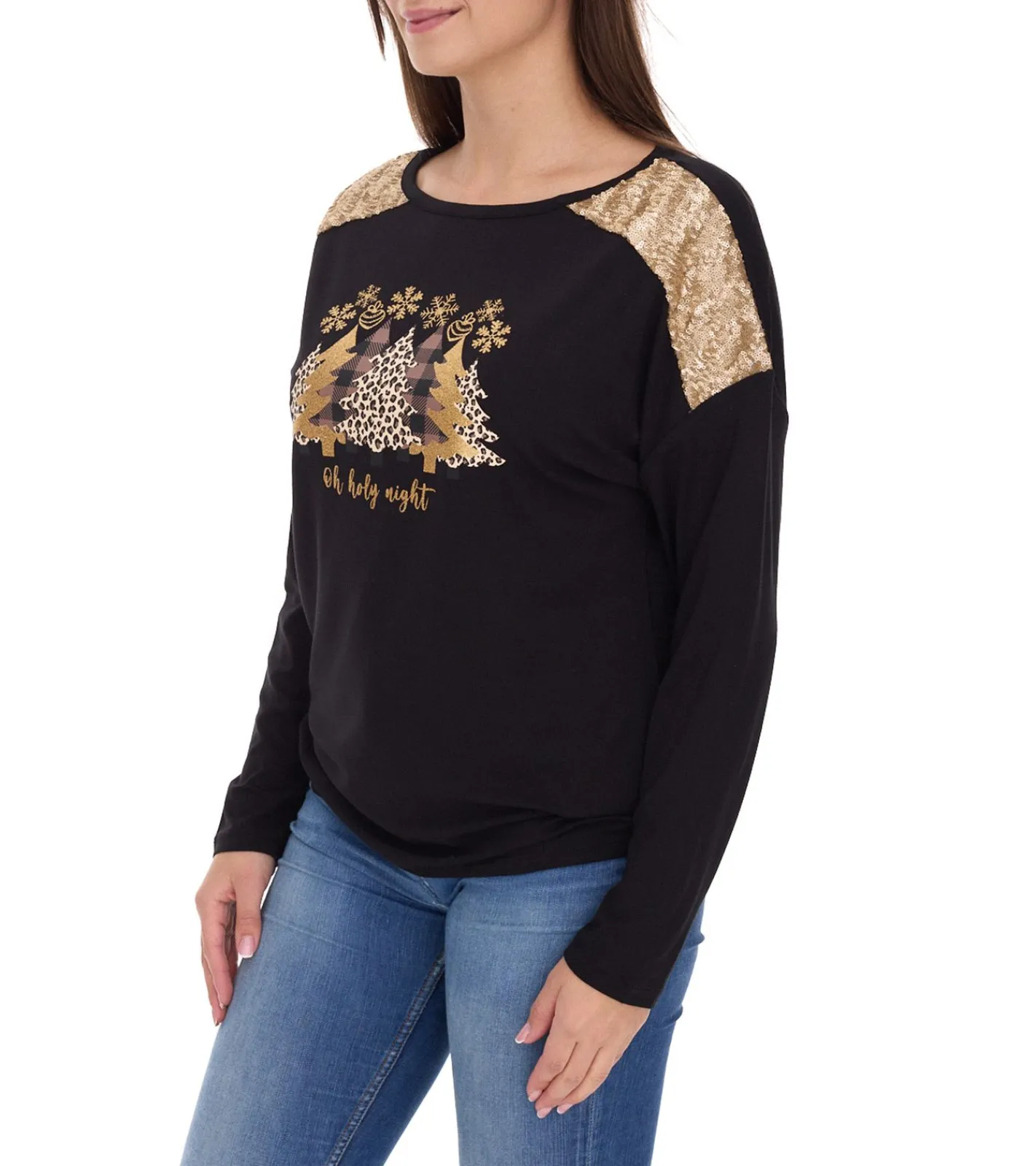 Damen Langarm-Pullover mit Weihnachts-Muster Shirt mit Pailletten Longsleeve mit Glitzer-Aufdruck 951384 Schwarz/Gold
